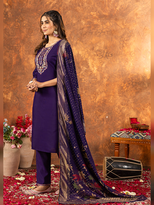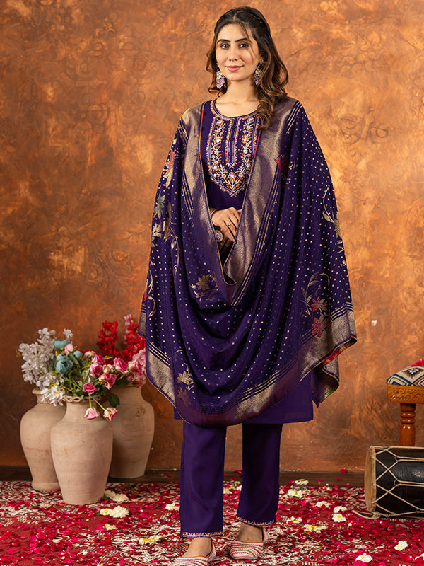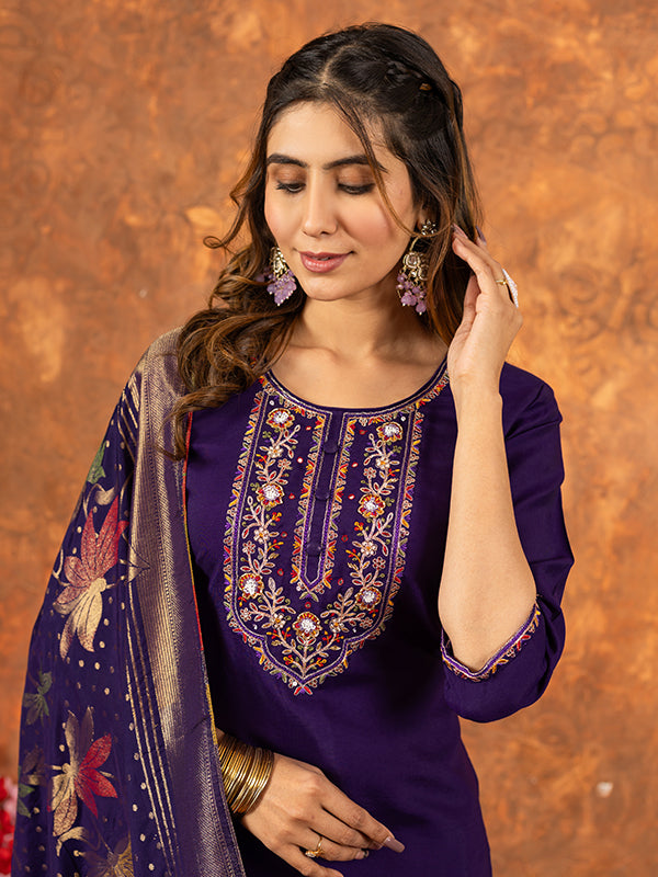 Purple Marina Silk Embroidered With Hand Work Suit Set Purple Marina Silk Embroidered With Hand Work Suit Set