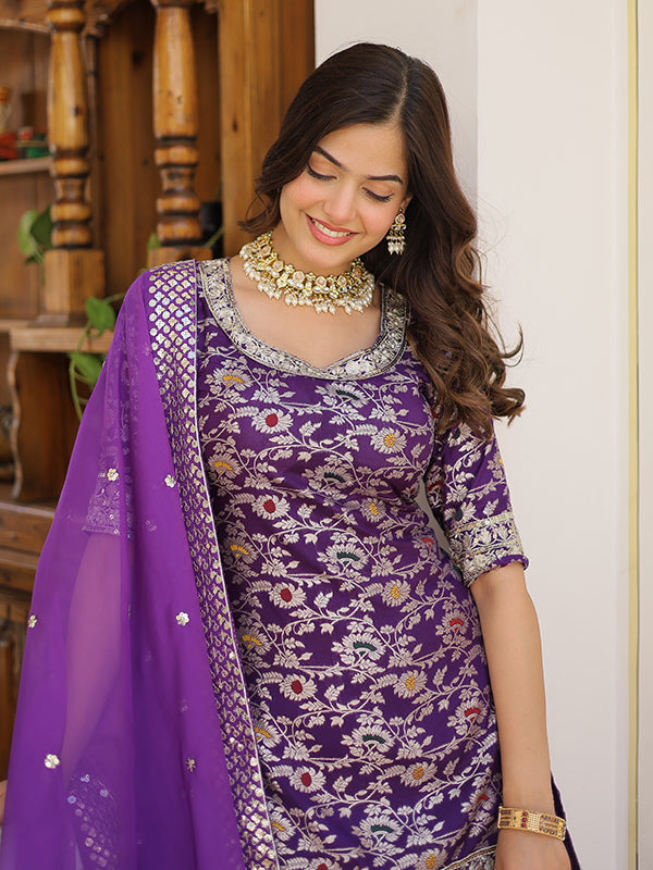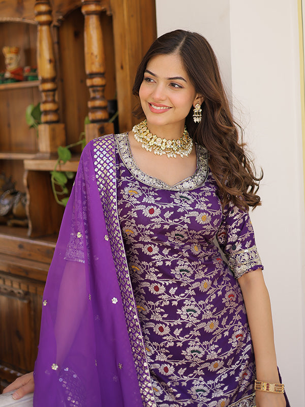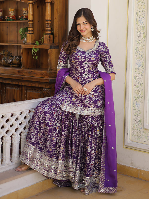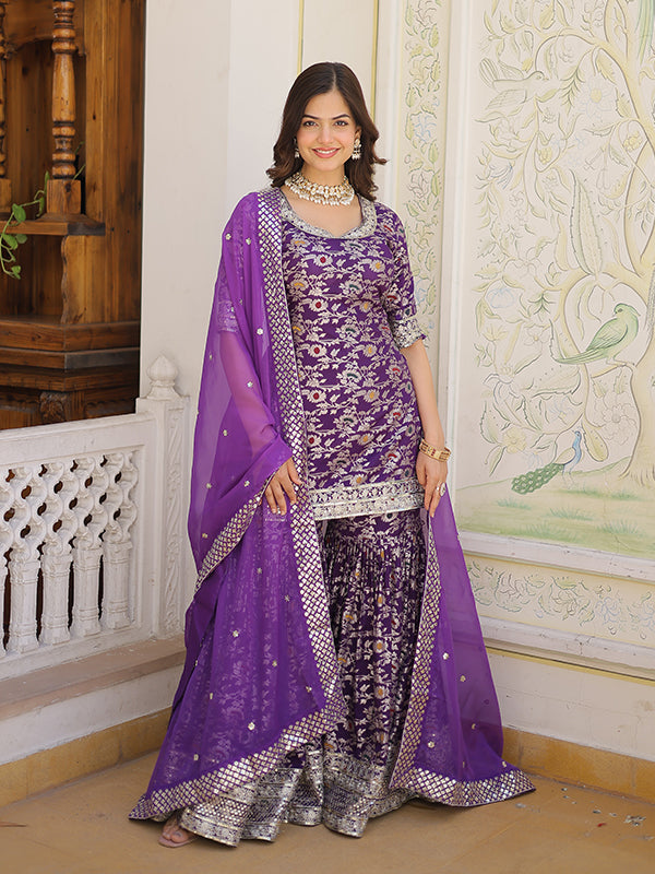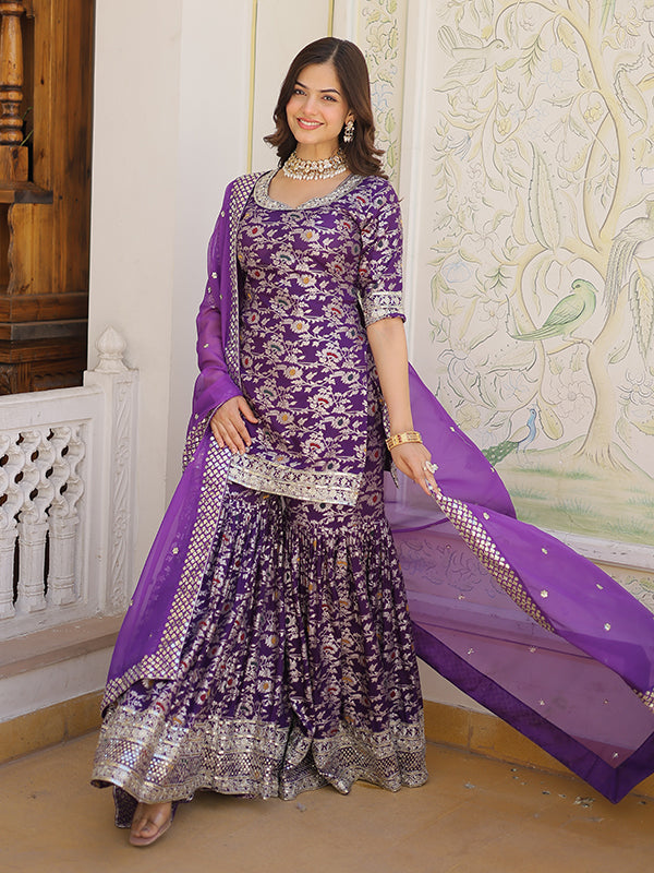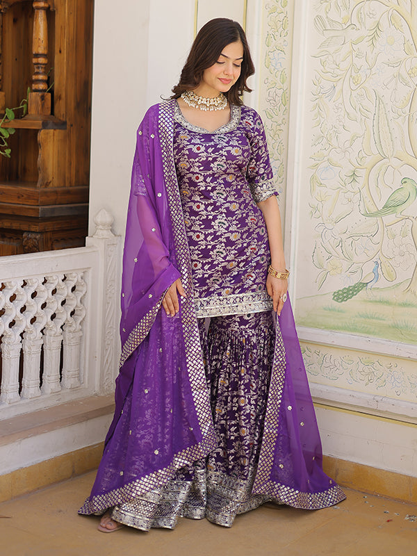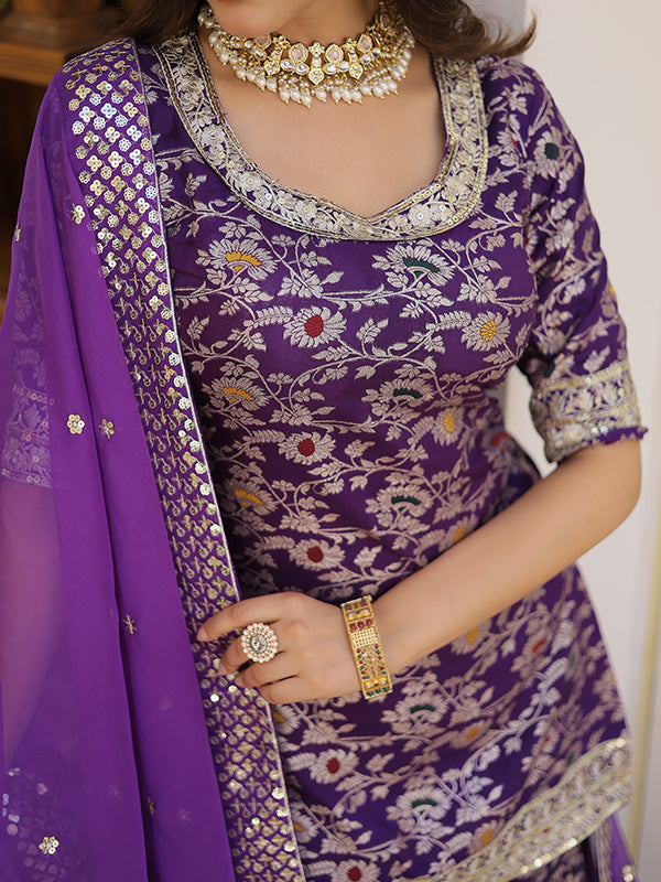 Purple Viscose Jacquerd Embroidered Kurta With Sharara & Dupatta – Vamikaa