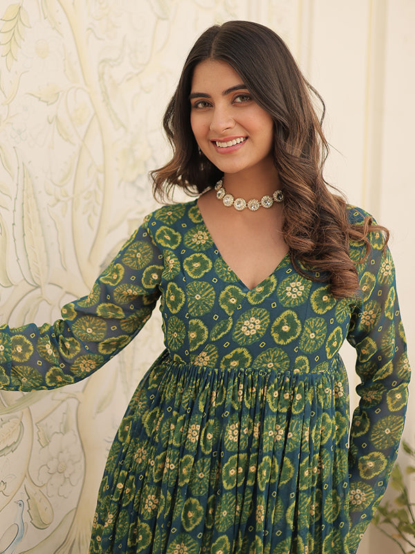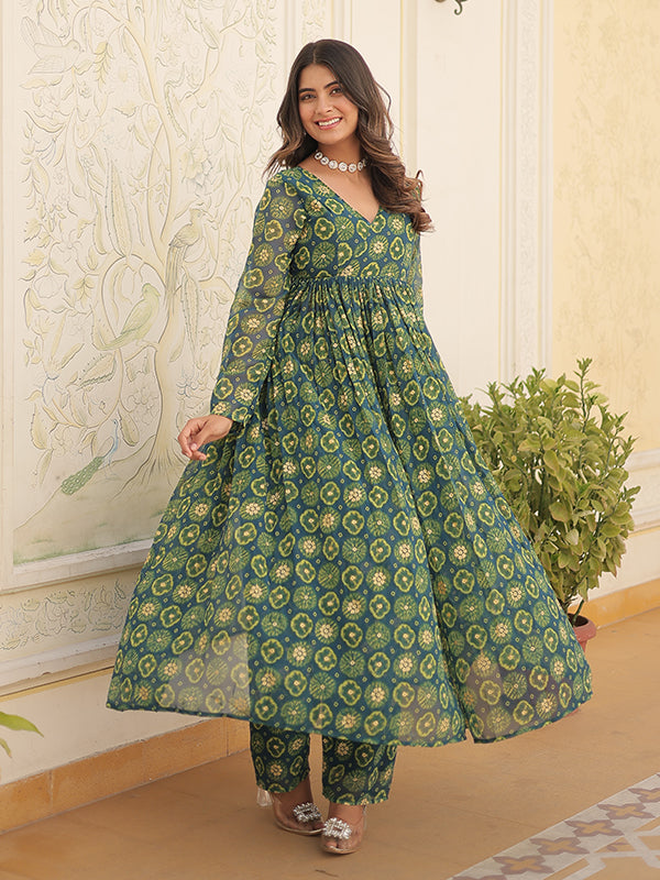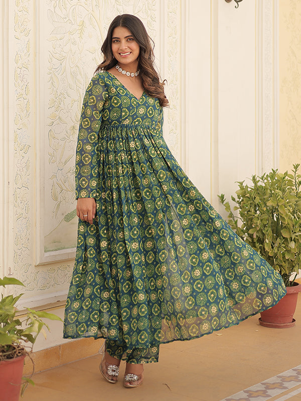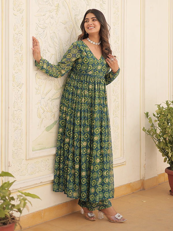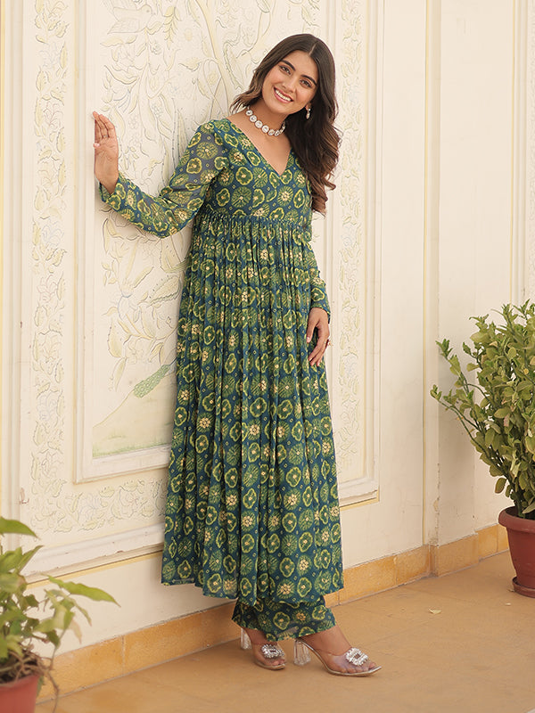 Rama Green Foil Printed Faux Georgette Kurti With Pant Set – Vamikaa