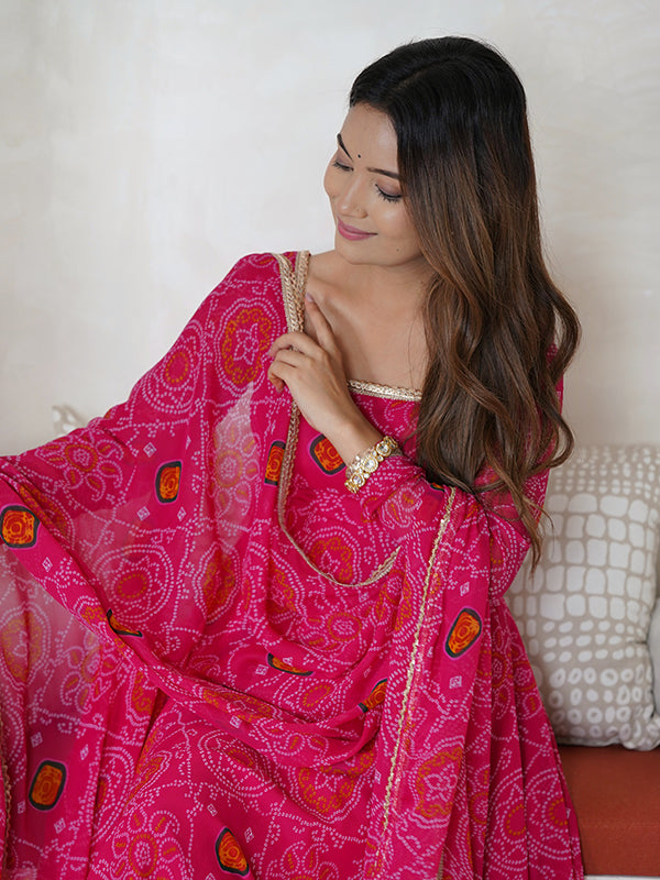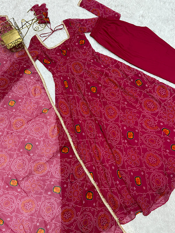 Rani Bandhej Printed Anarkali Gown With Pant & Dupatta Set – Vamikaa