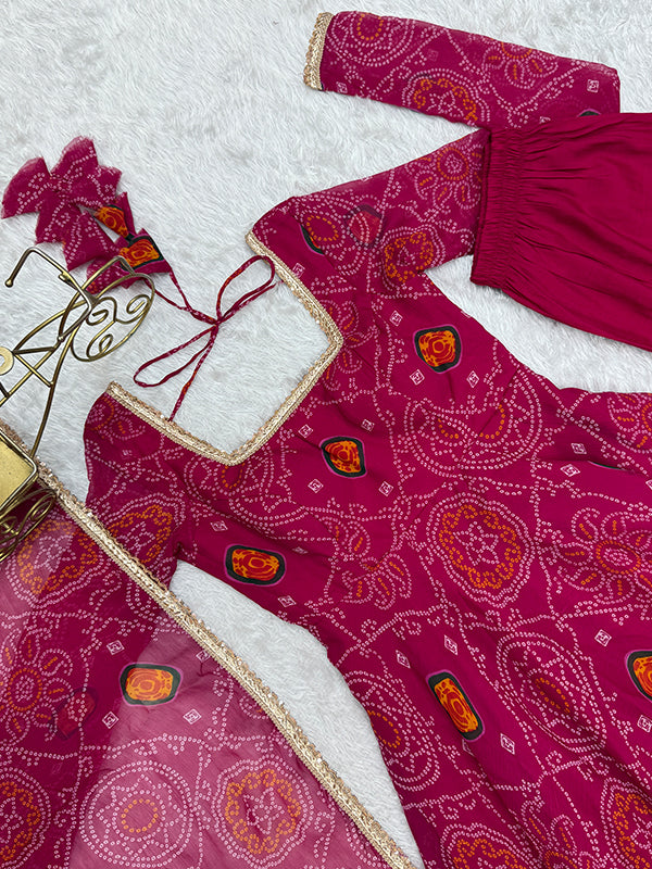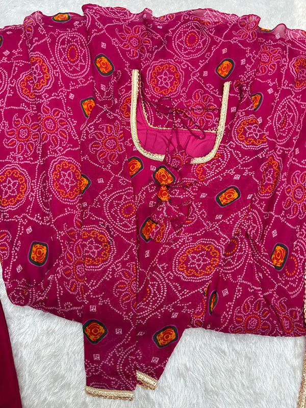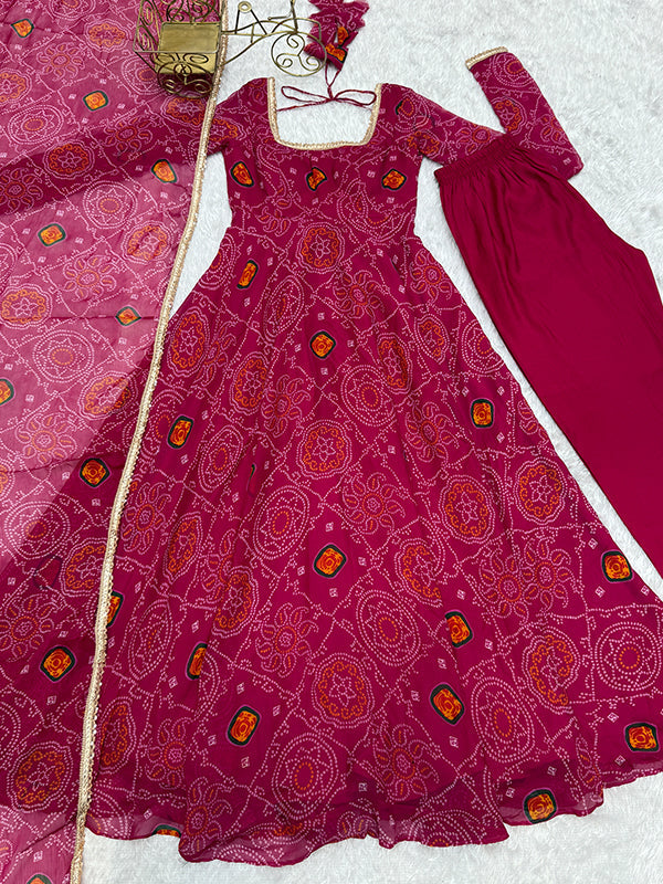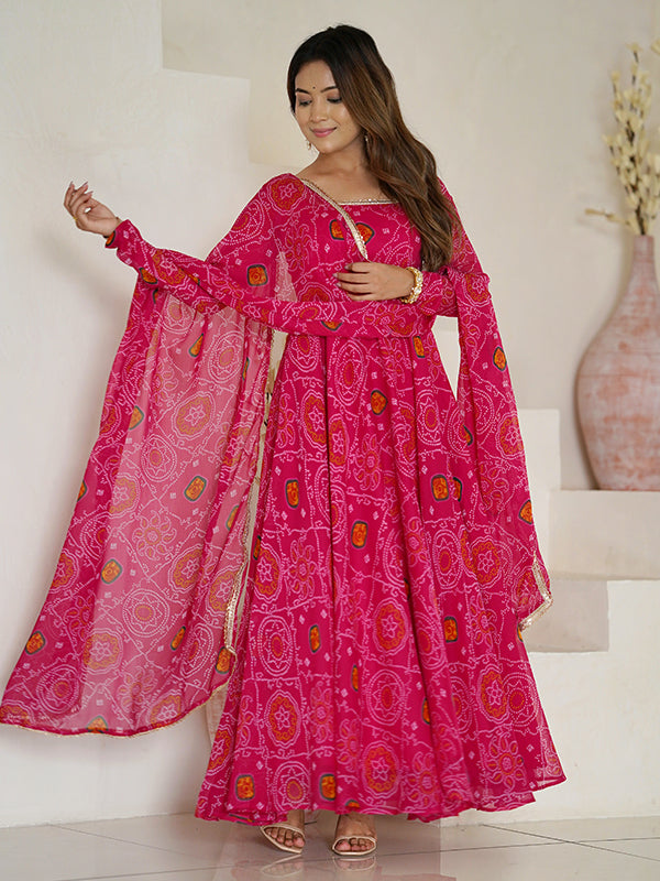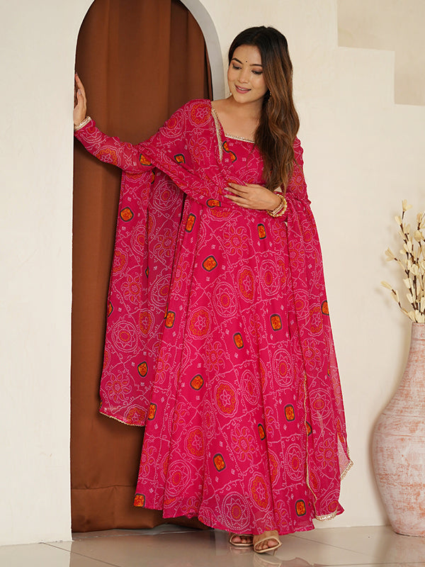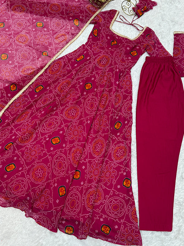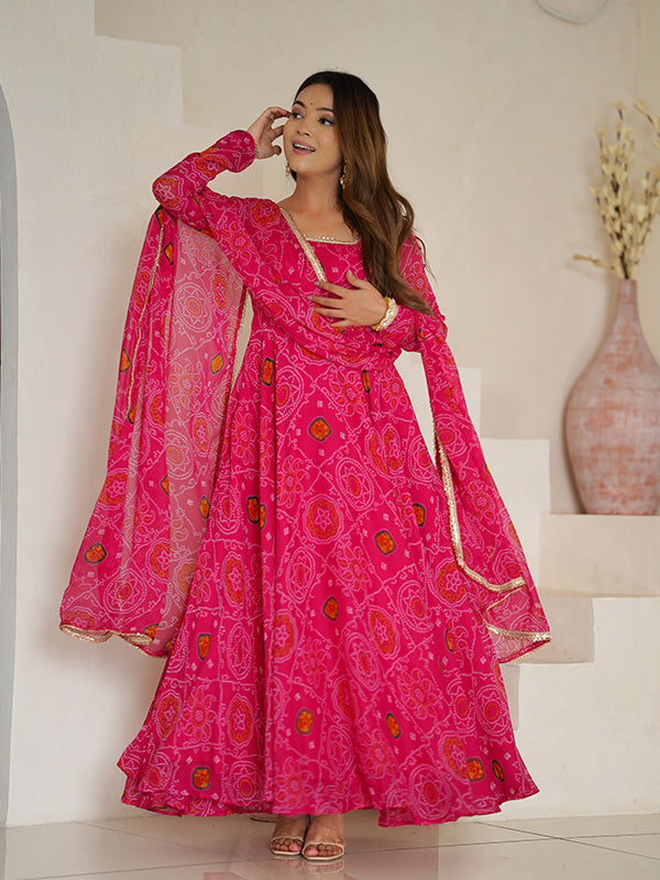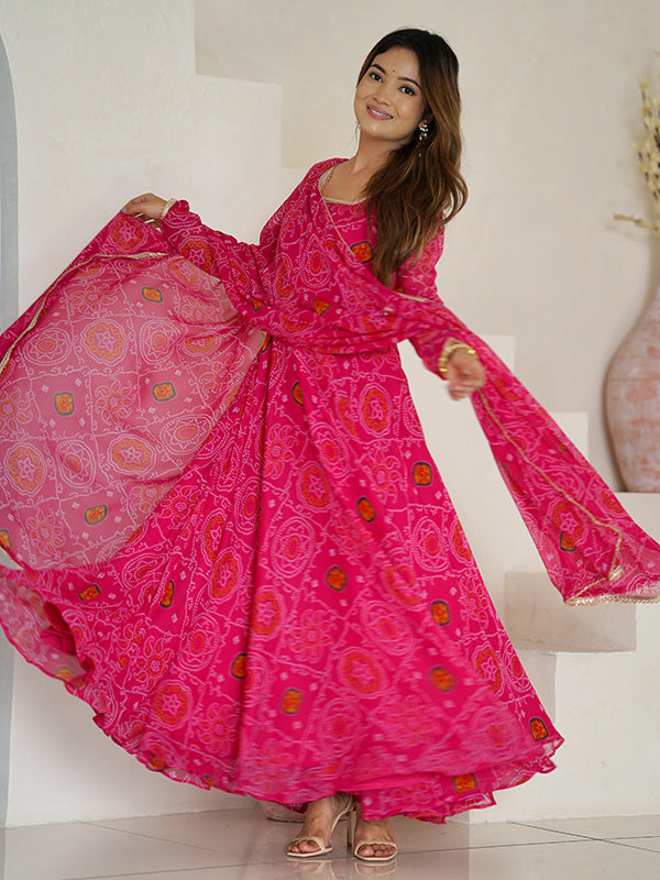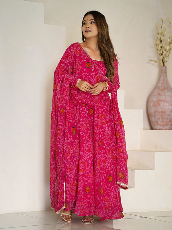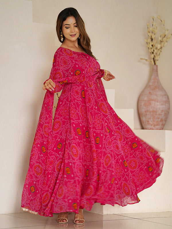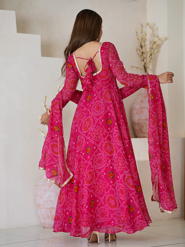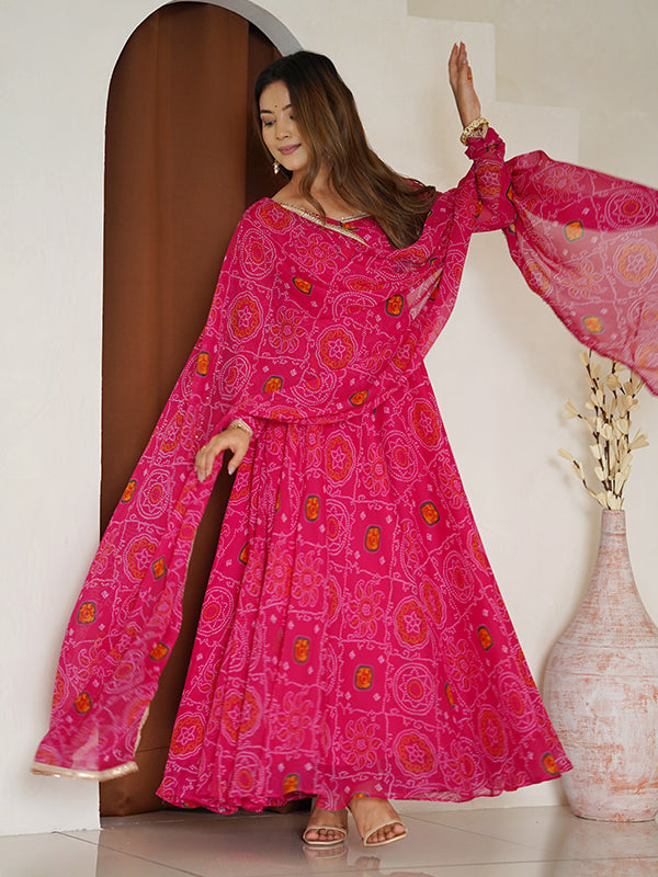 Rani Bandhej Printed Anarkali Gown With Pant & Dupatta Set