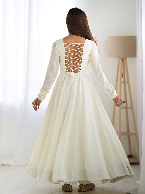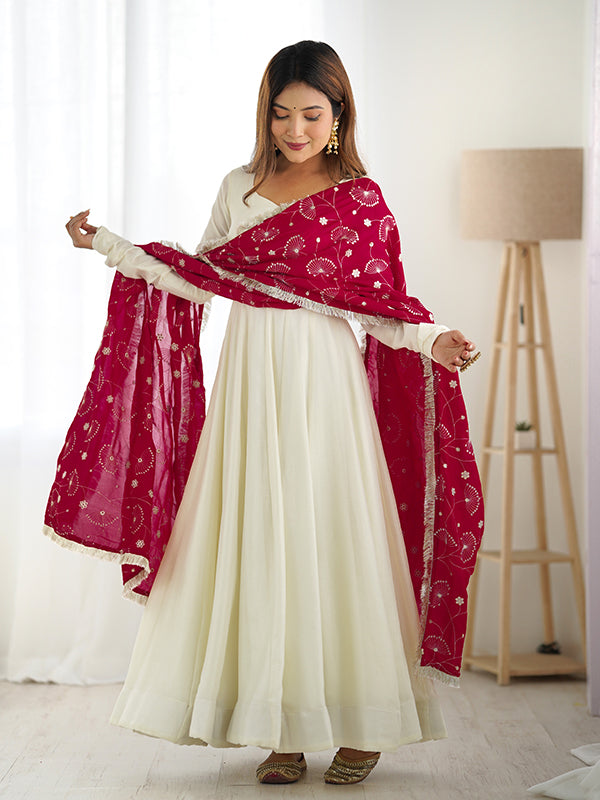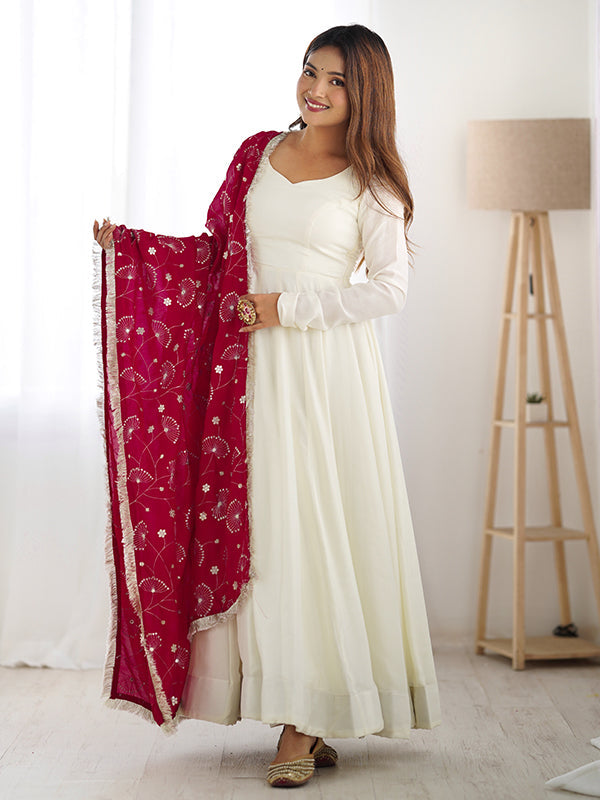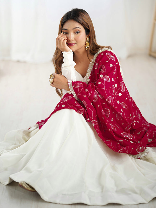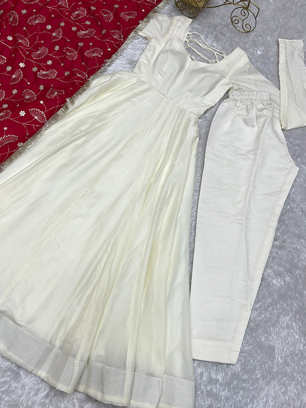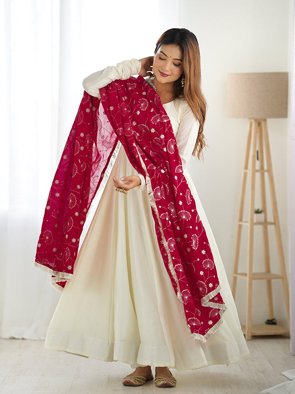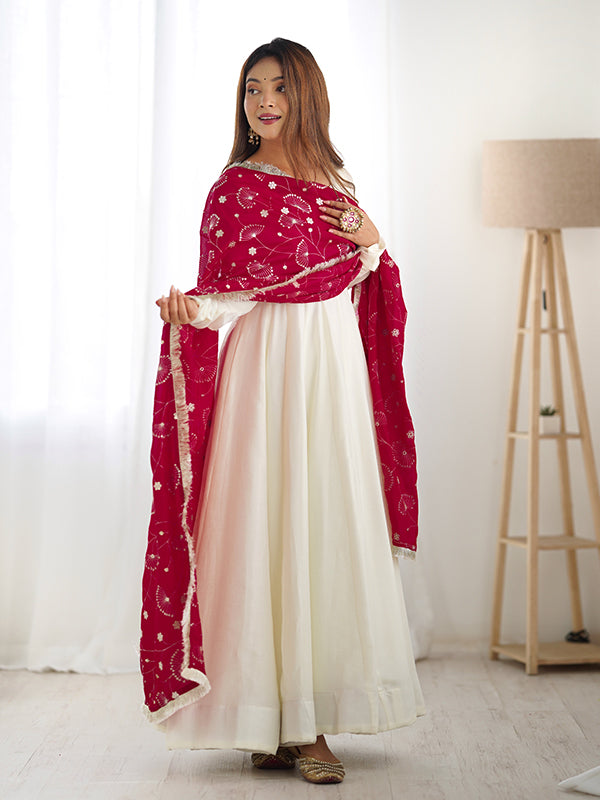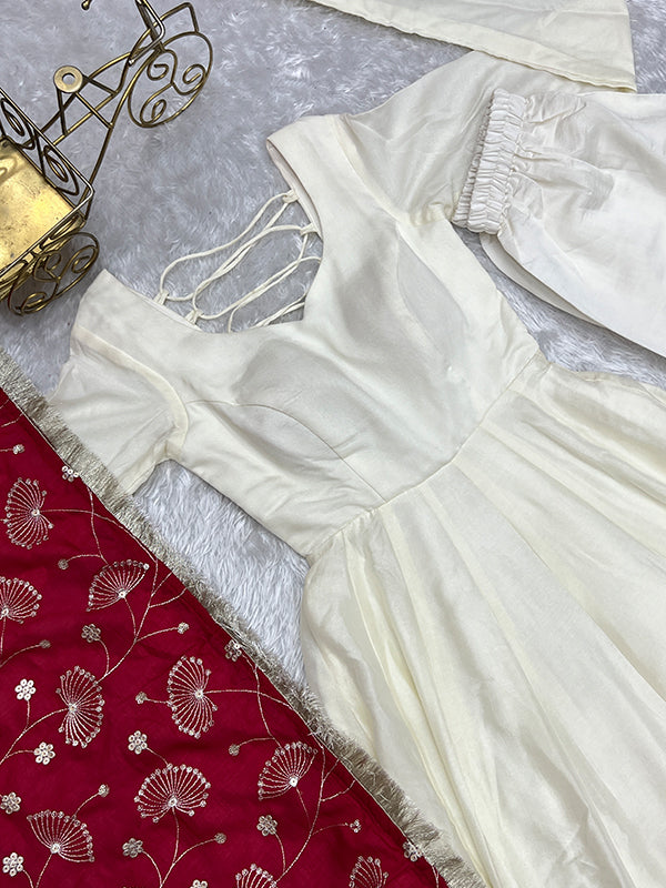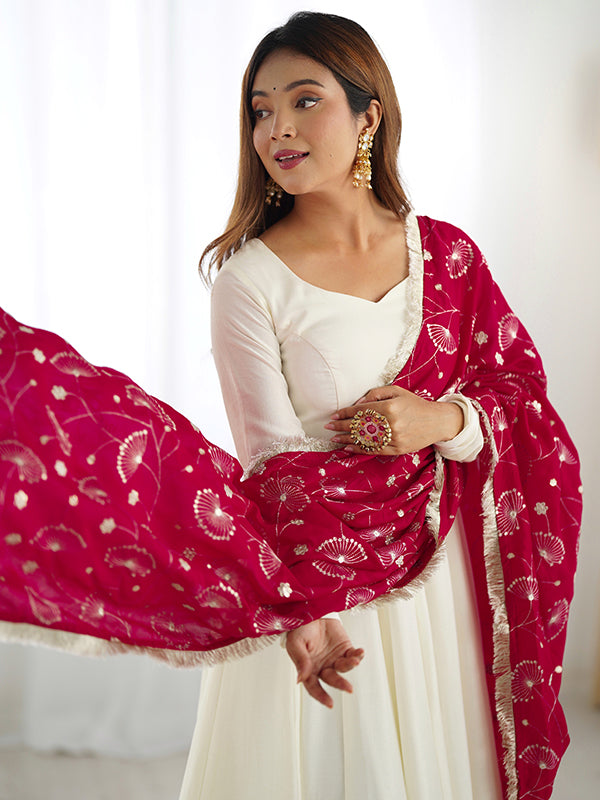 Rani Pink Dupatta Vichitra Silk Off White Anarkali Gown With Pant Set Rani Pink Dupatta Vichitra Silk Off White Anarkali Gown With Pant Set