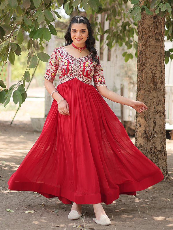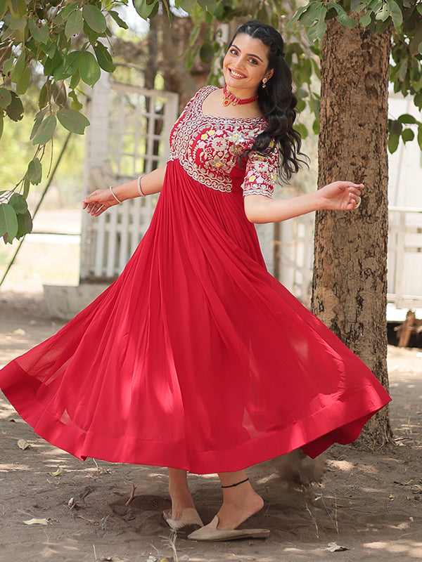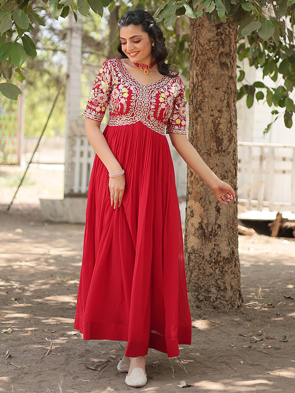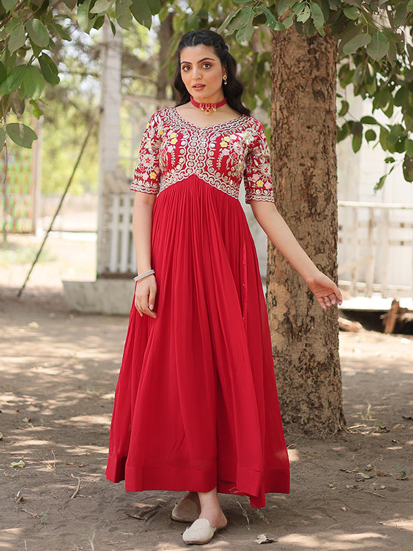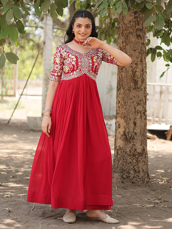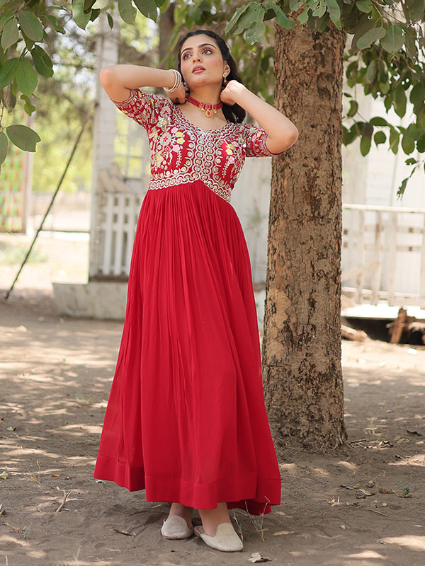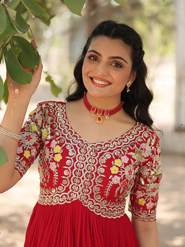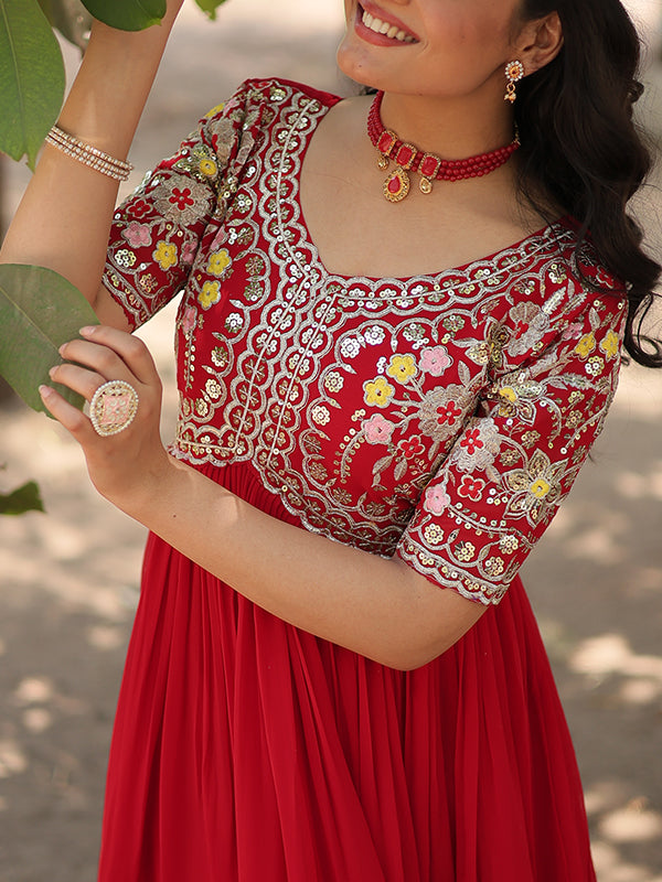 Red Faux Blooming With Embroidery Zari Sequins Gown – Vamikaa