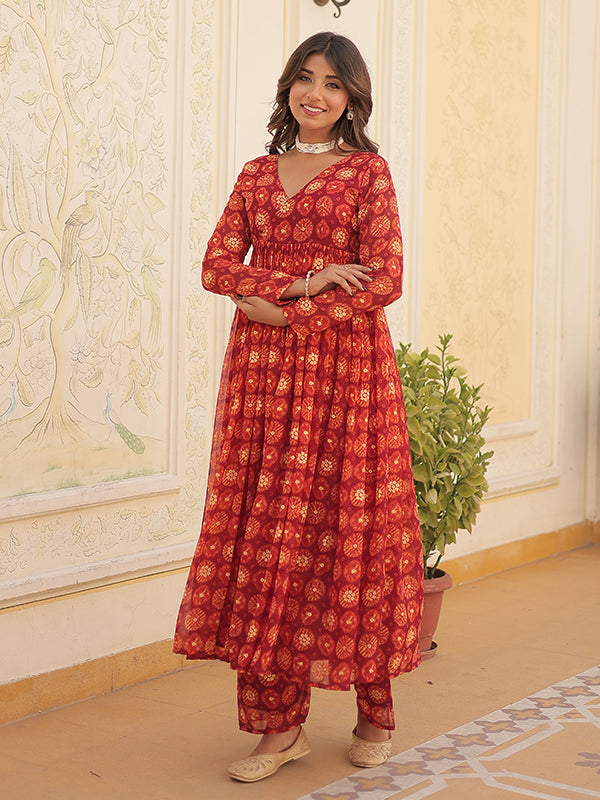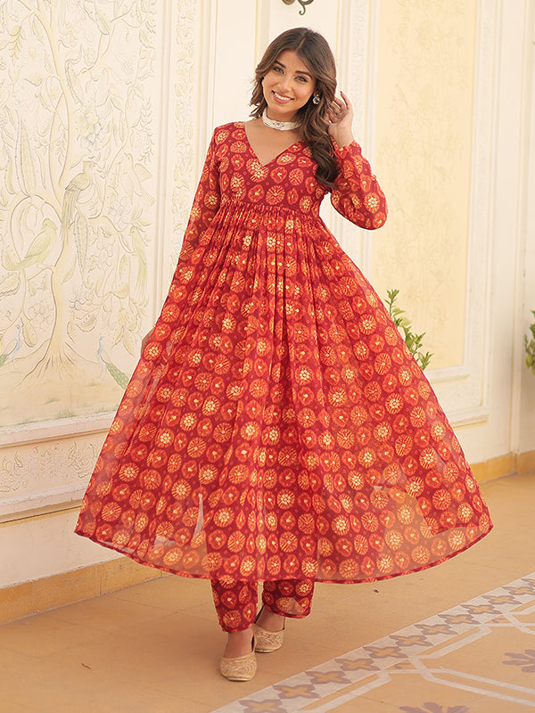 Red Foil Printed Faux Georgette Kurti With Pant Set – Vamikaa