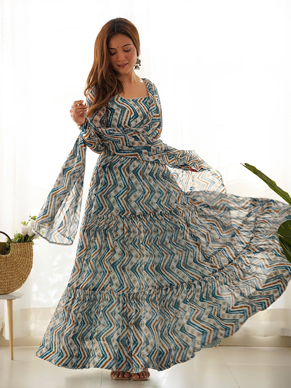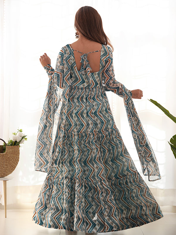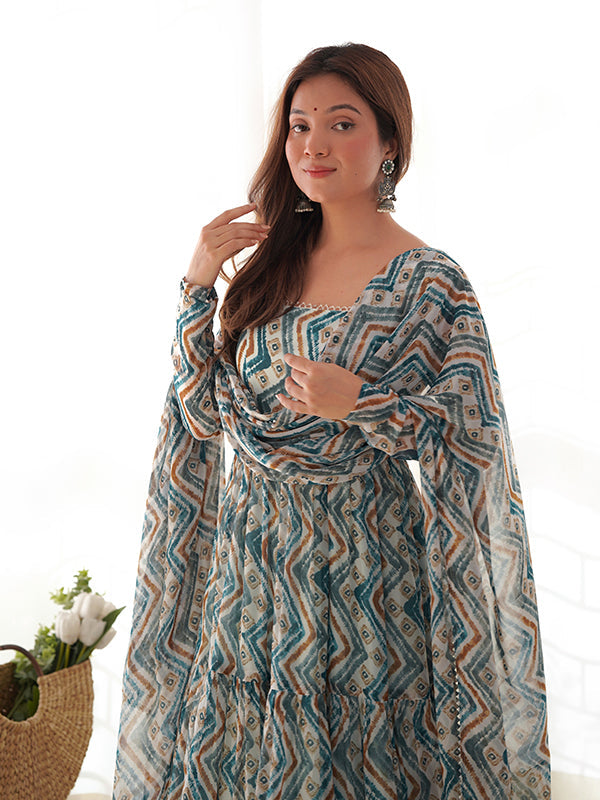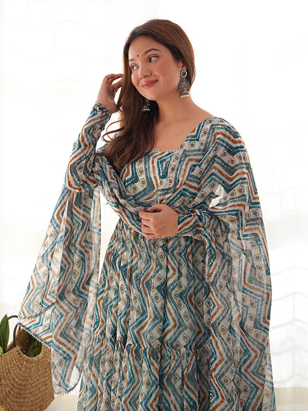 Sky Zigzag Print Georgette Anarkali Kurti With Pant Dupatta Set – Vamikaa