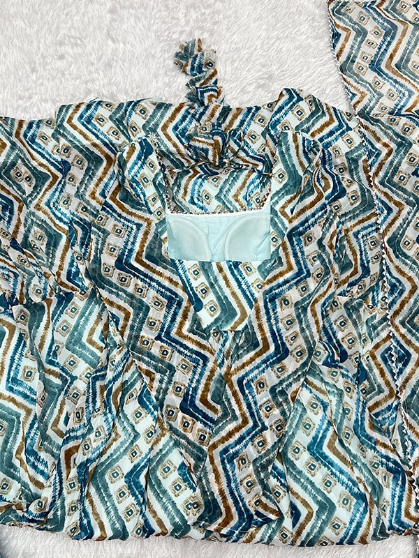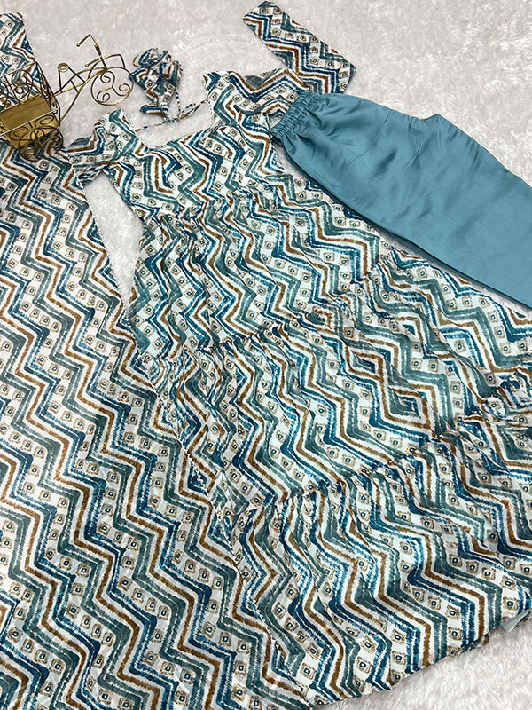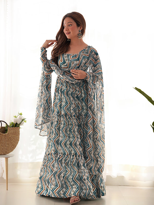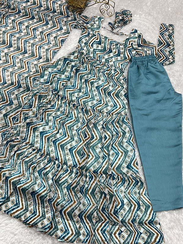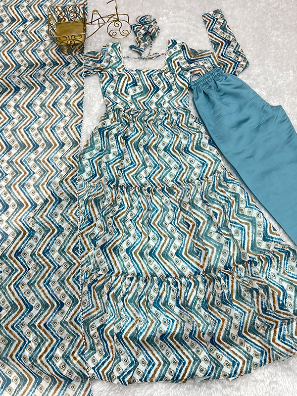 Sky Zigzag Print Georgette Anarkali Kurti With Pant Dupatta Set Sky Zigzag Print Georgette Anarkali Kurti With Pant Dupatta Set