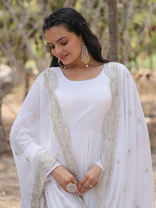White Faux Blooming Plain Gown With Sequins Work Dupatta White Faux Blooming Plain Gown With Sequins Work Dupatta