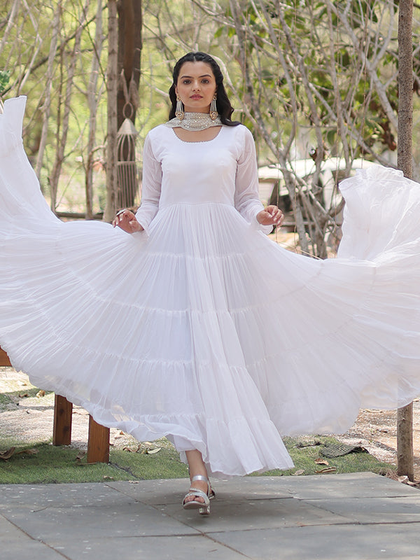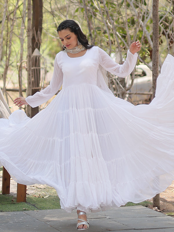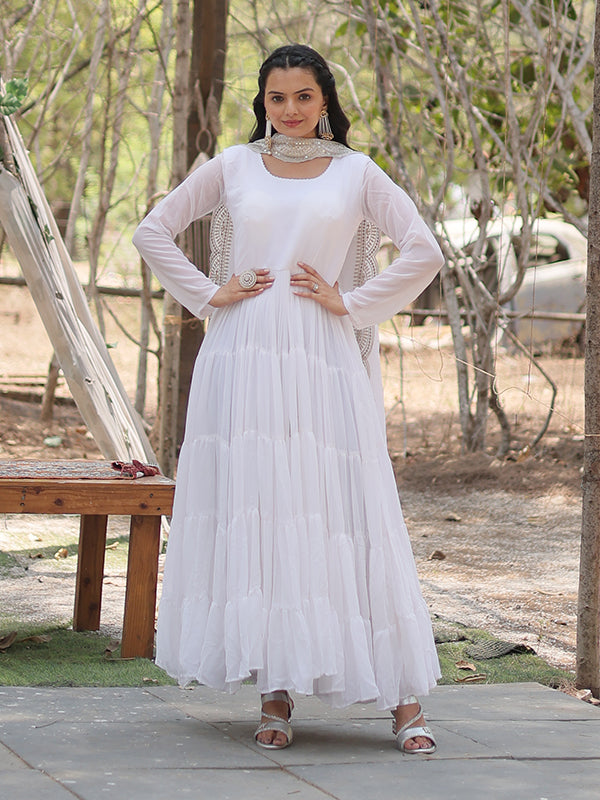 Buy White Faux Blooming Plain Gown With Sequins Work Dupatta Online. This Kurti Is A Must Have In Every Woman's Wardrobe.