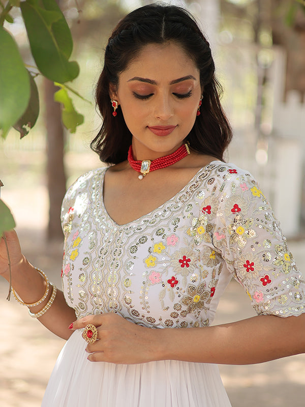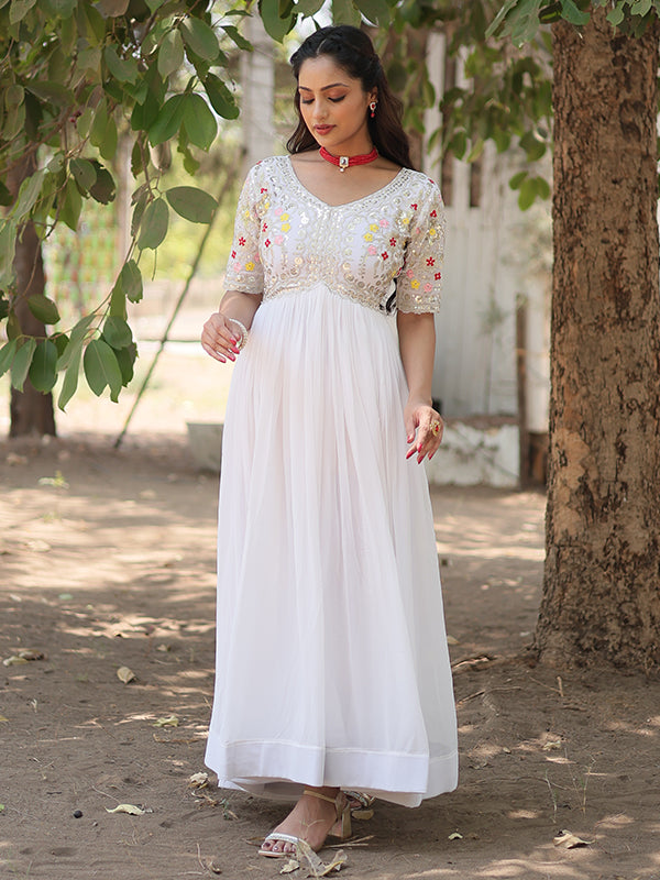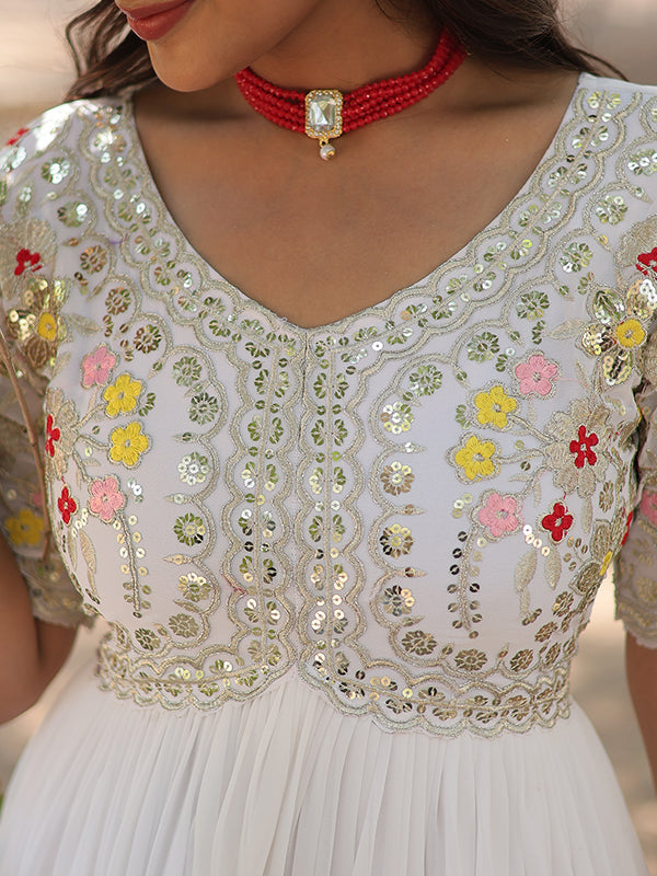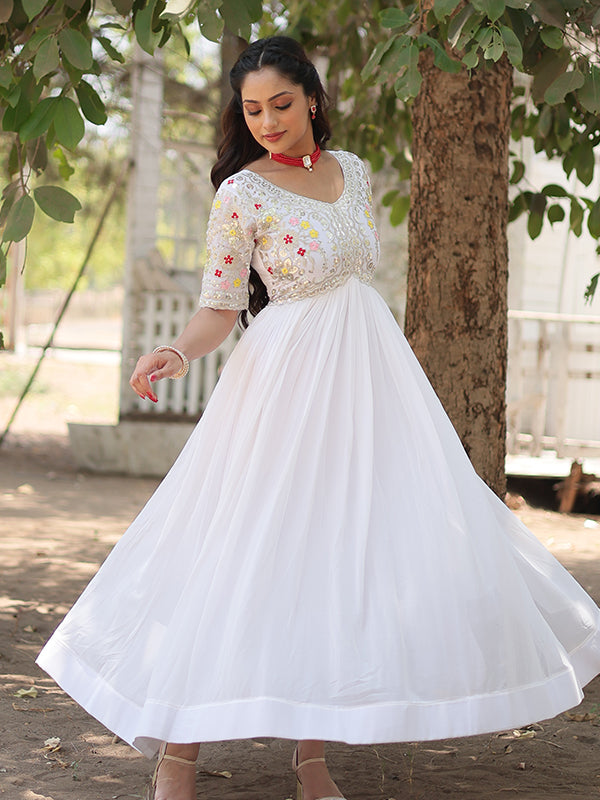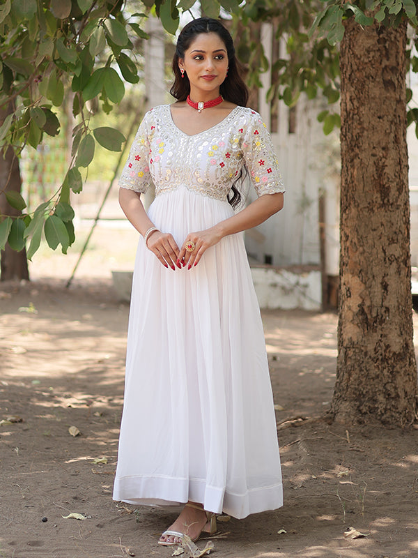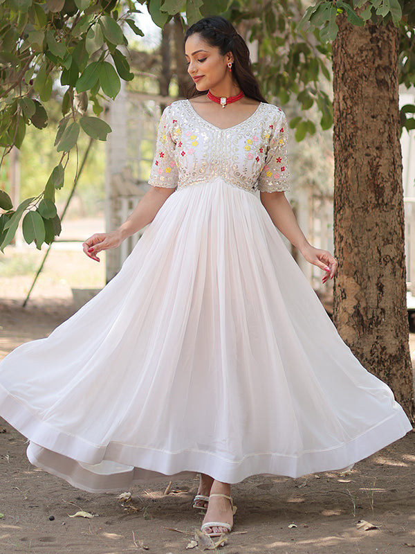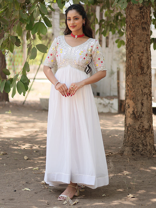 White Faux Blooming With Embroidery Zari Sequins Gown – Vamikaa