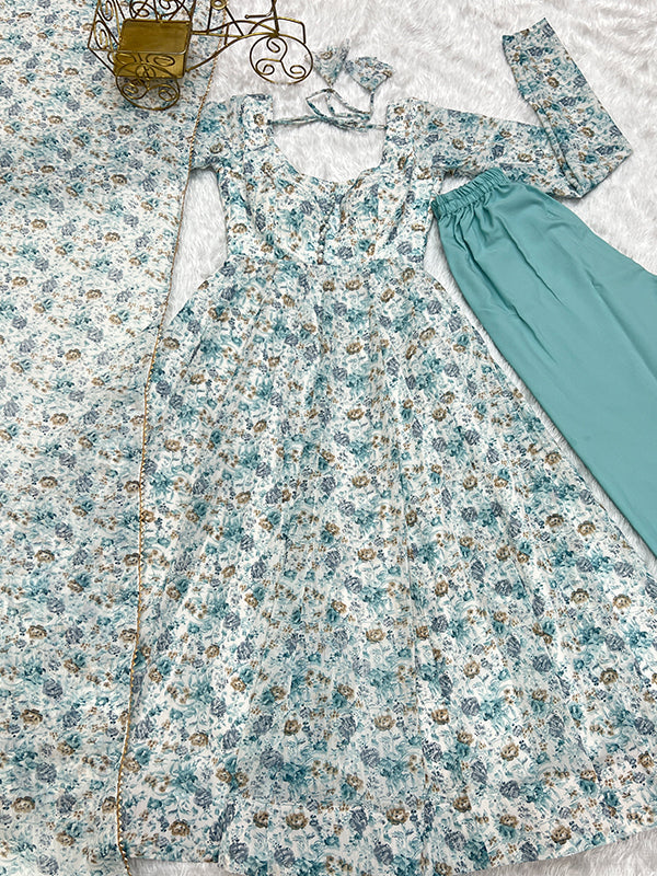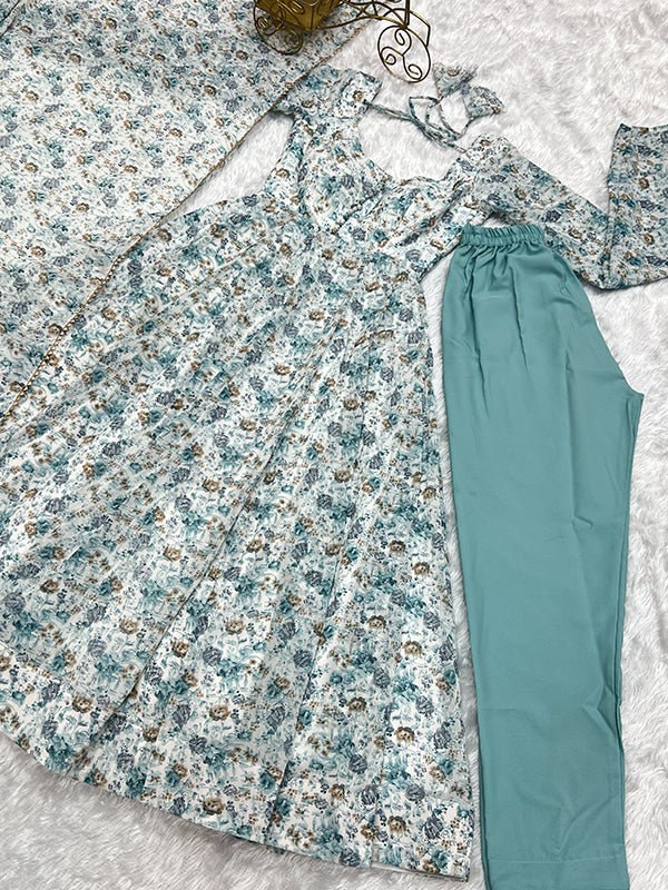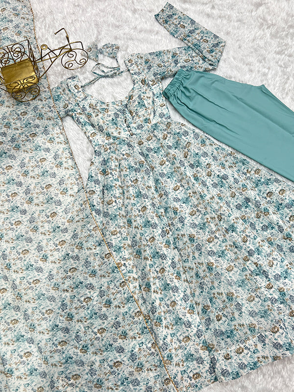 White Fulwari Organza Printed Anarkali Kurti With Pant & Dupatta Set
