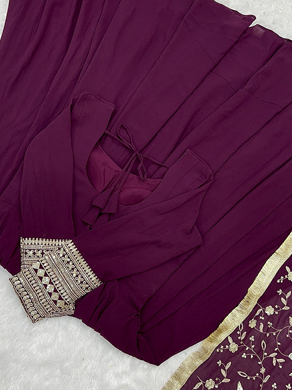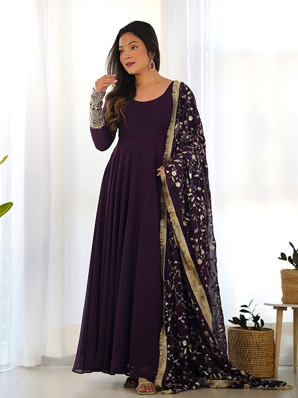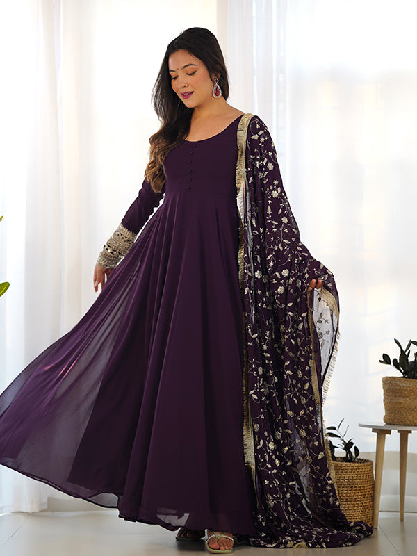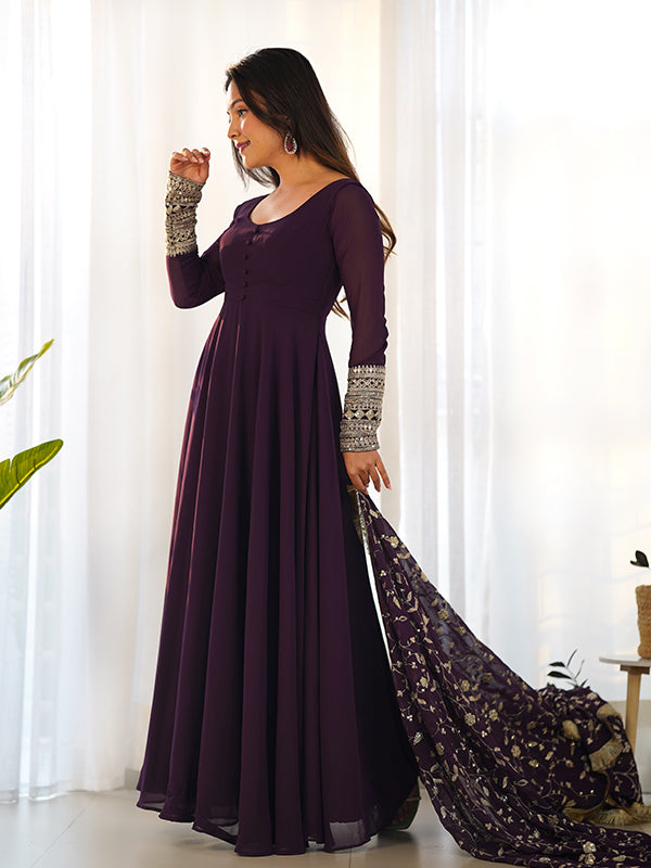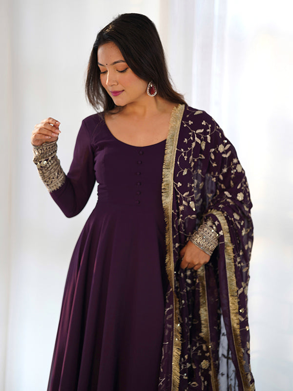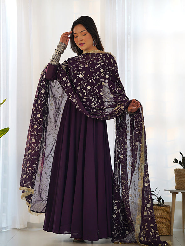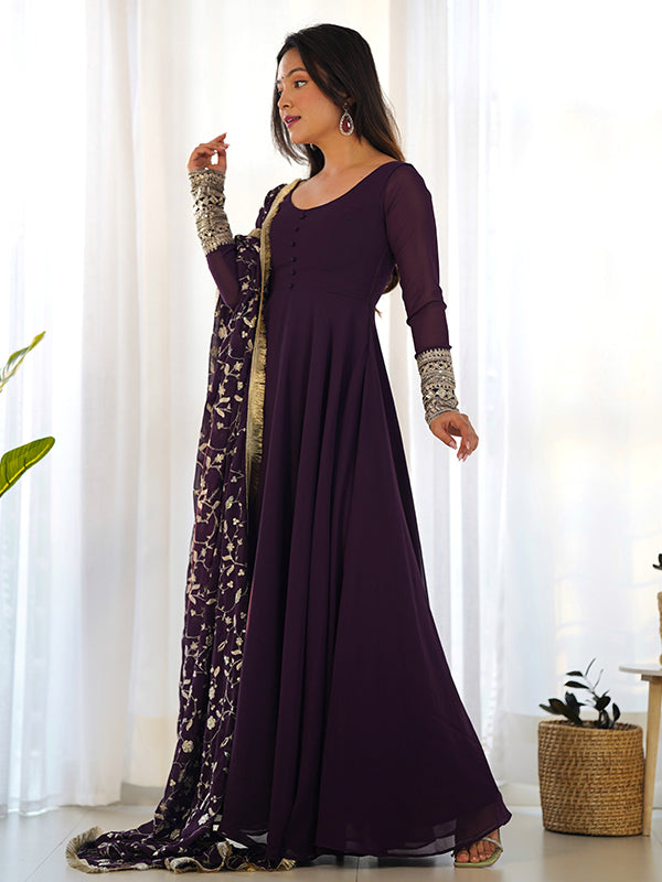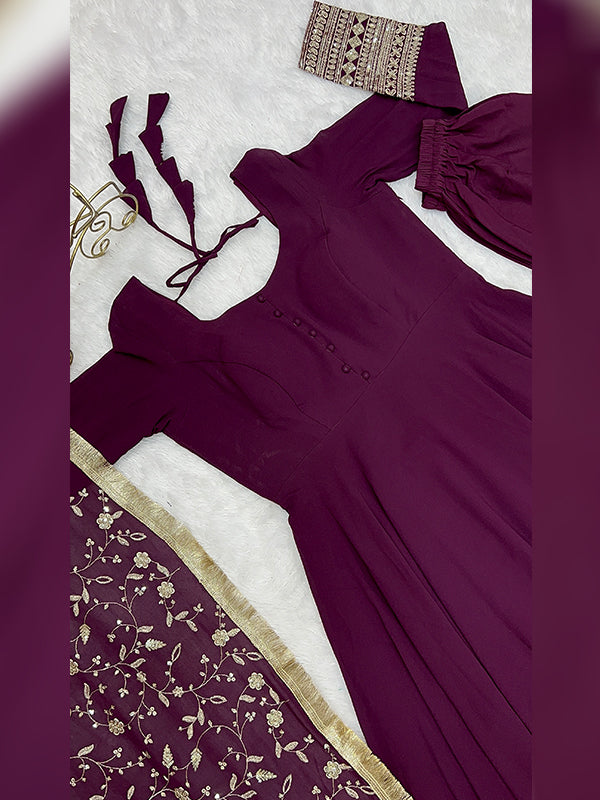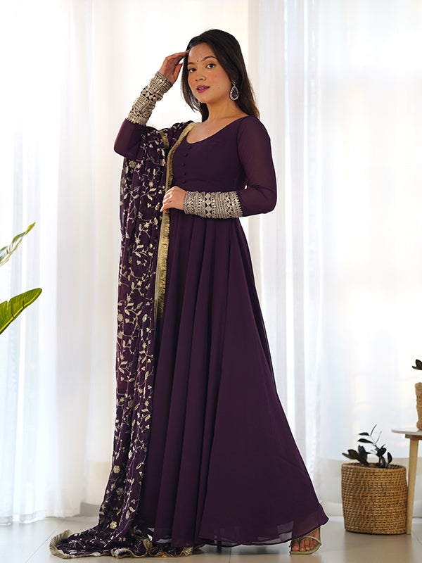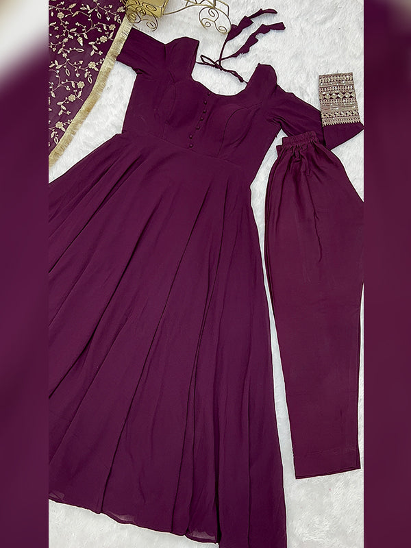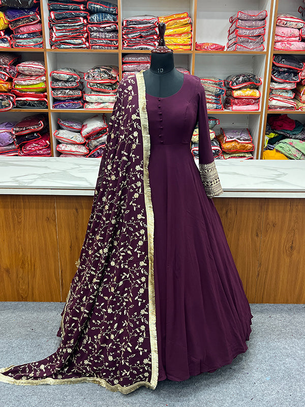 Wine Anarkali Georgette Gown With Golden Dupatta Set Wine Anarkali Georgette Gown With Golden Dupatta Set
