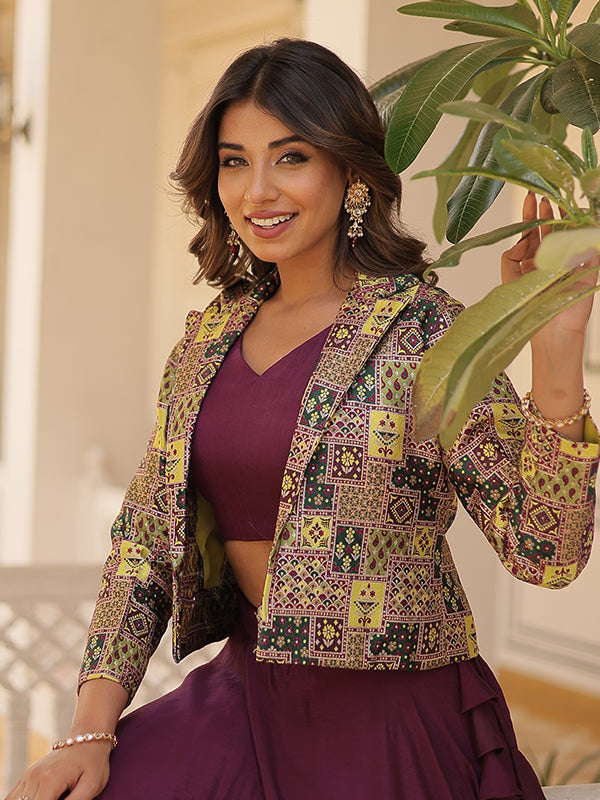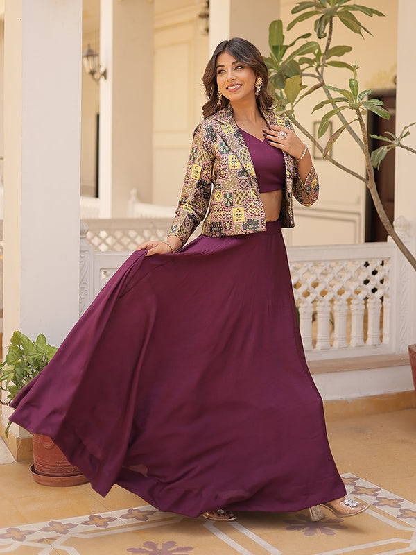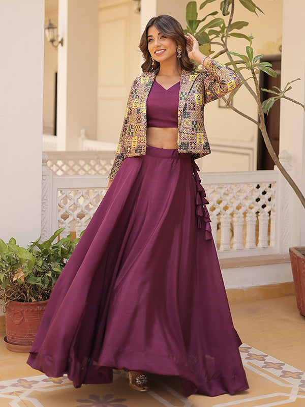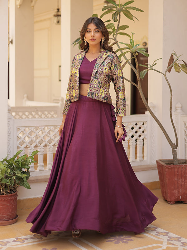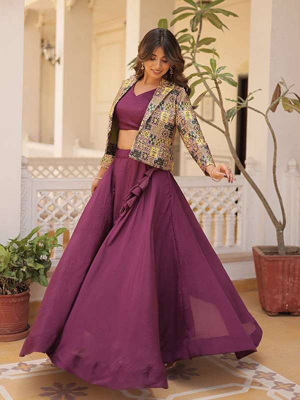 Wine Chinon Lehenga Choli With Jquard Designer Koti – Vamikaa