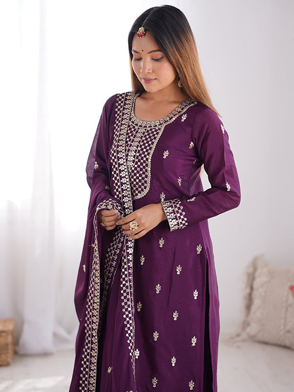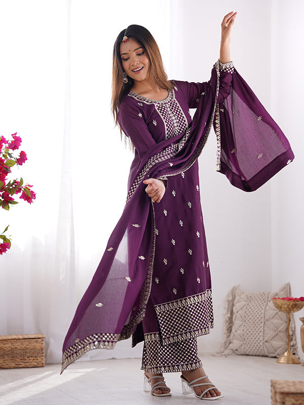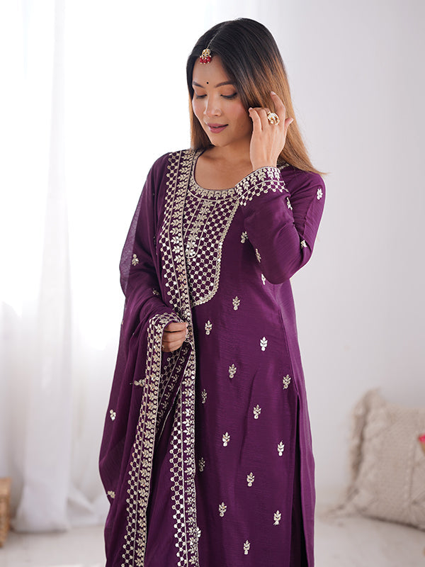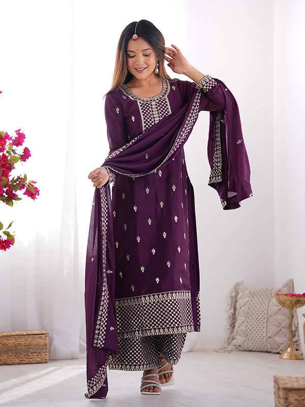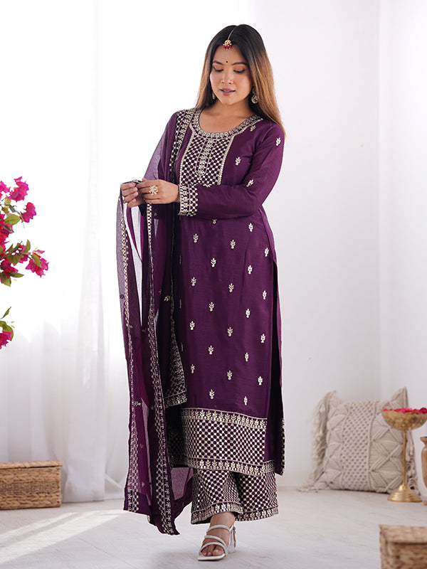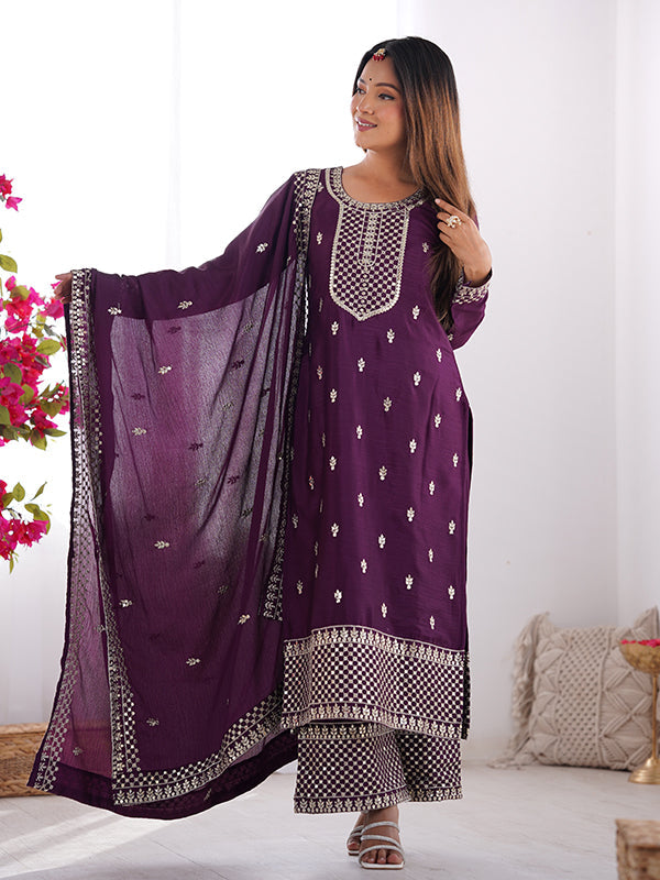 Wine Chinon Silk Straight Kurti With Pant & Dupatta Set – Vamikaa