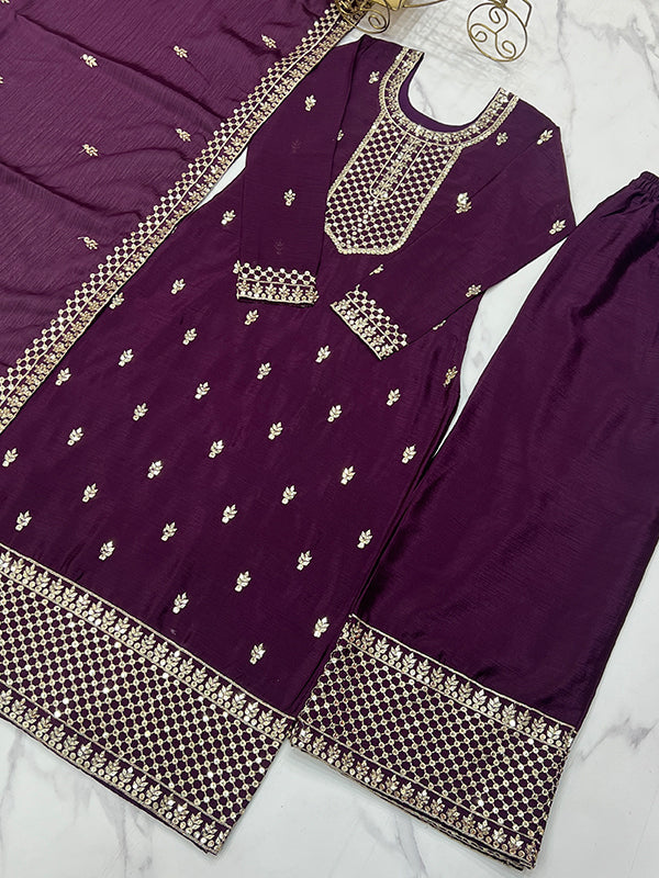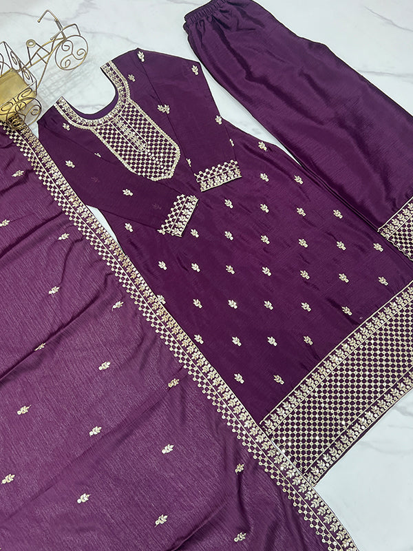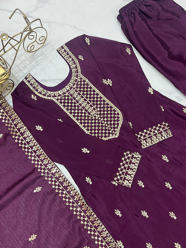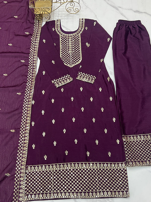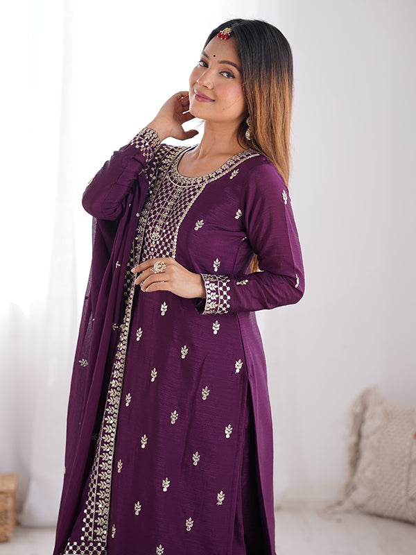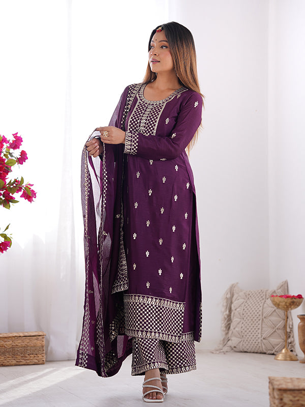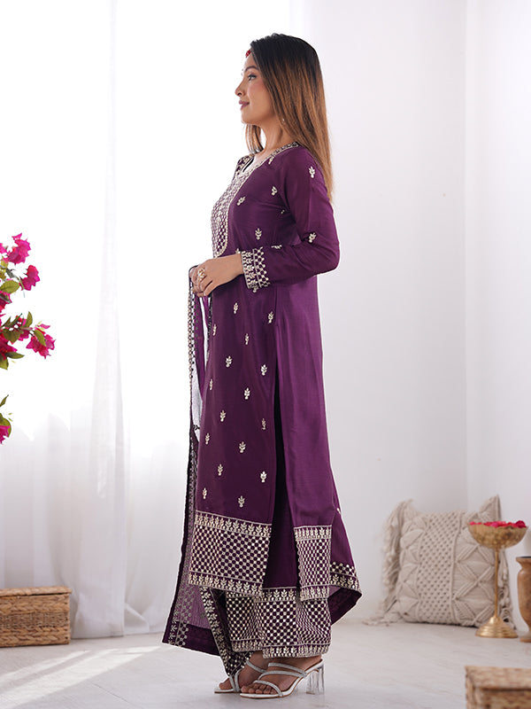 Wine Chinon Silk Straight Kurti With Pant & Dupatta Set – Vamikaa