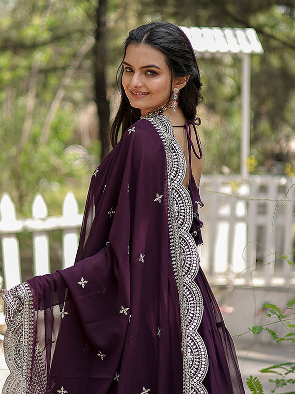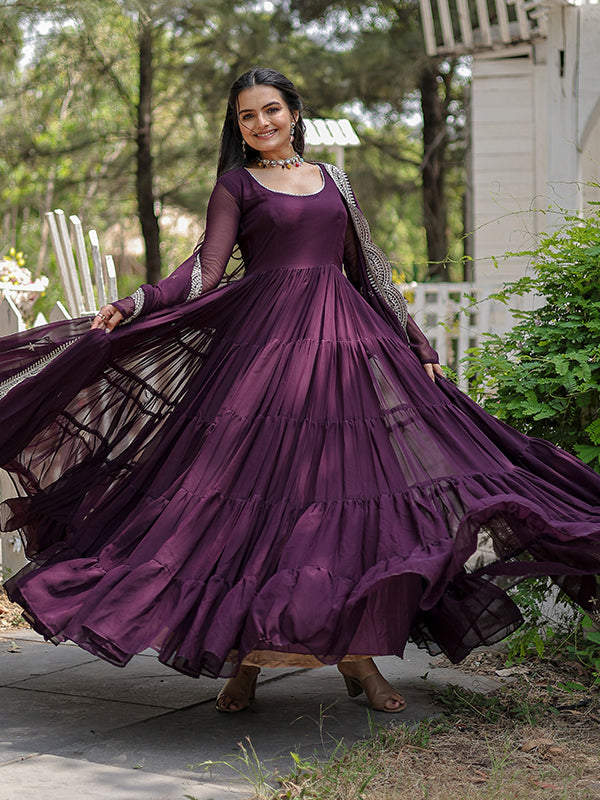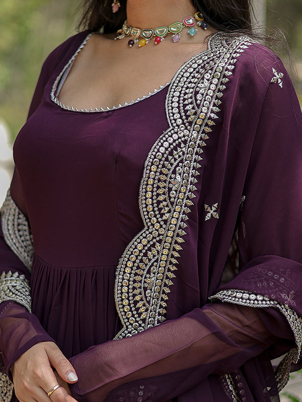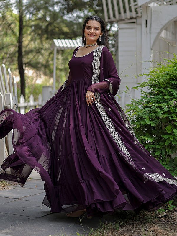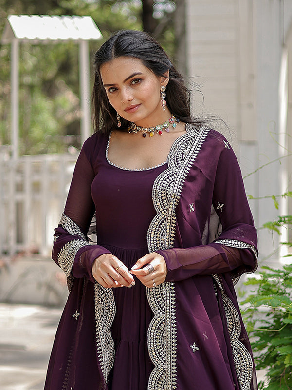 Wine Faux Blooming Plain Gown With Sequins Work Dupatta – Vamikaa