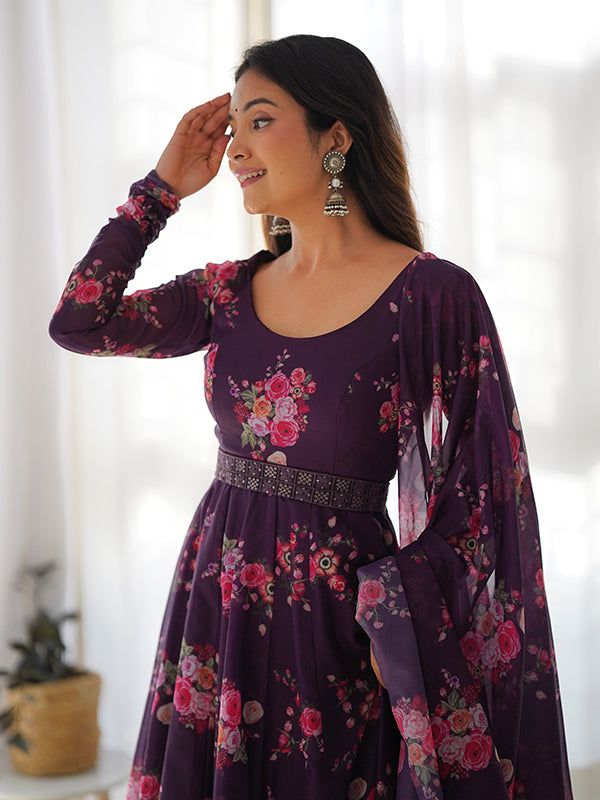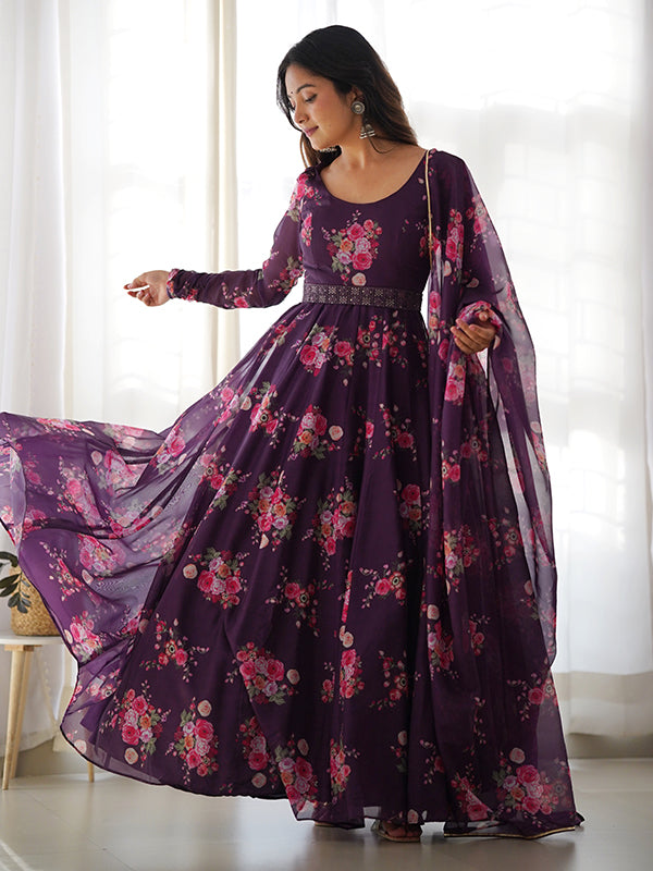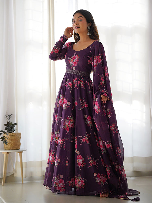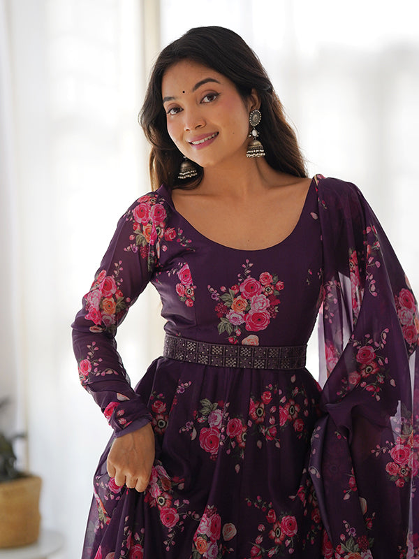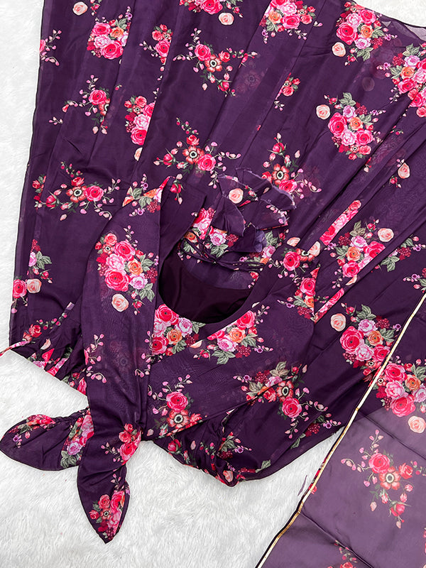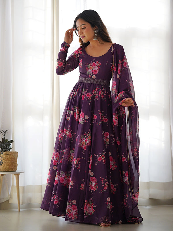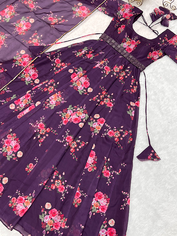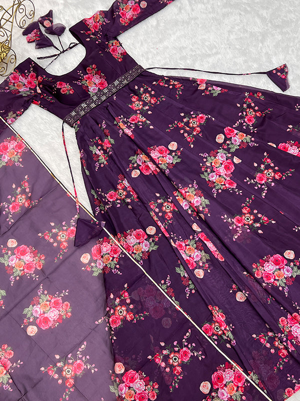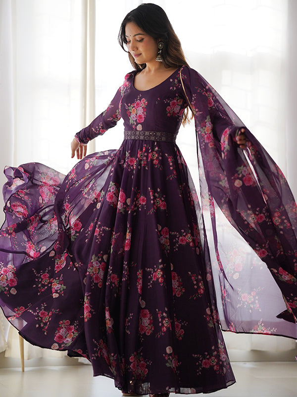 Wine Organza Printed Anarkali Kurti With Pant & Dupatta Set Wine Organza Printed Anarkali Kurti With Pant & Dupatta Set