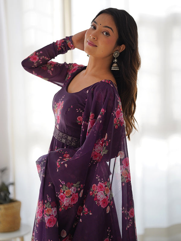 Wine Organza Printed Anarkali Kurti With Pant & Dupatta Set – Vamikaa