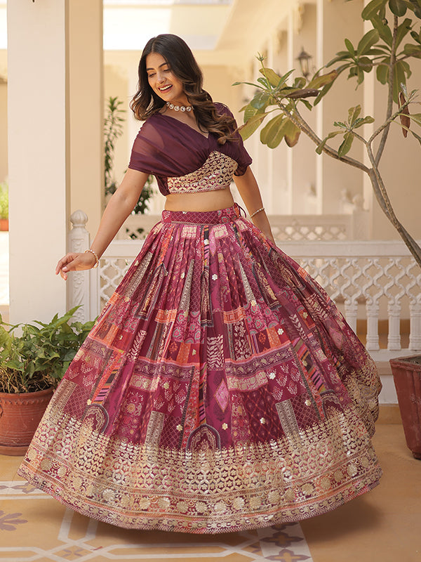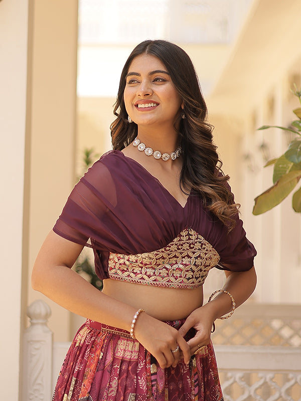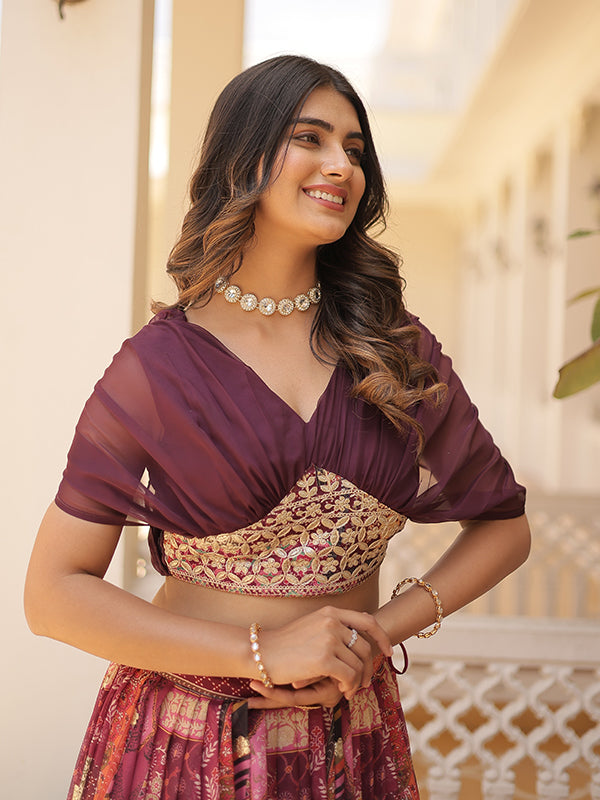Buy Wine Russian Silk Foil Embroidered Lehenga Choli Online. This Lehenga Choli Is A Must Have In Every Woman's Wardrobe.