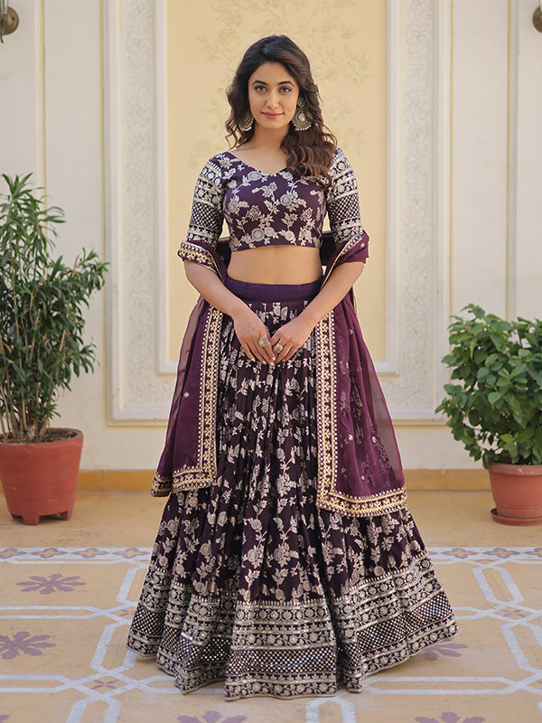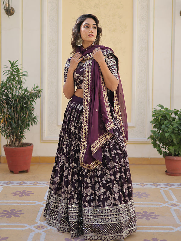Buy Wine Viscose Jacquard With Embroidered Sequins Lehenga Choli Online. This Lehenga Choli Is A Must Have In Every Woman's Wardrobe.