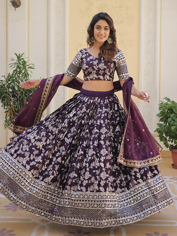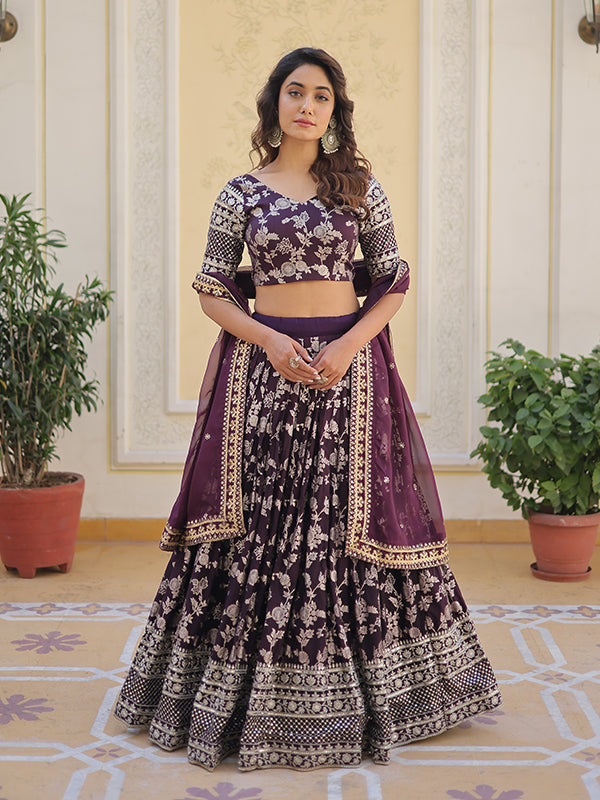 Wine Viscose Jacquard With Embroidered Sequins Lehenga Choli Wine Viscose Jacquard With Embroidered Sequins Lehenga Choli