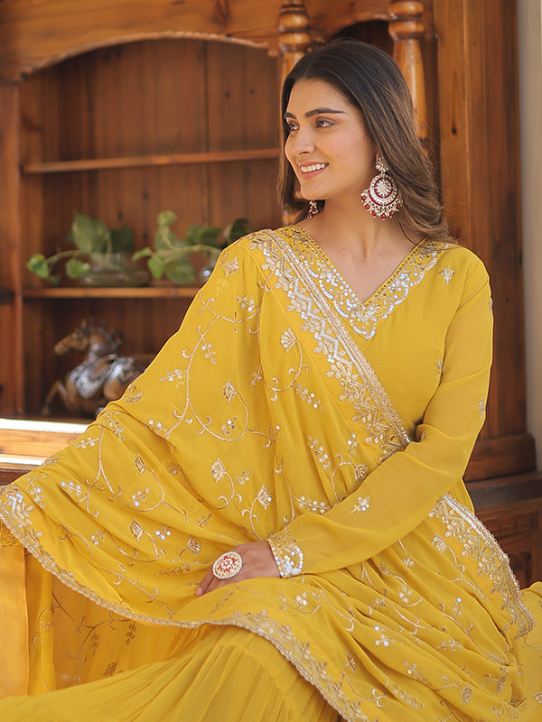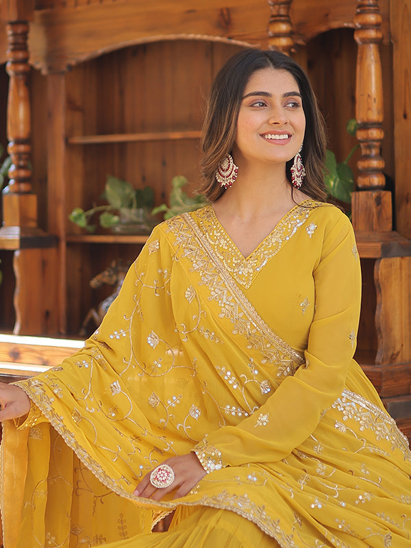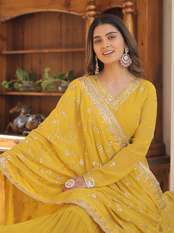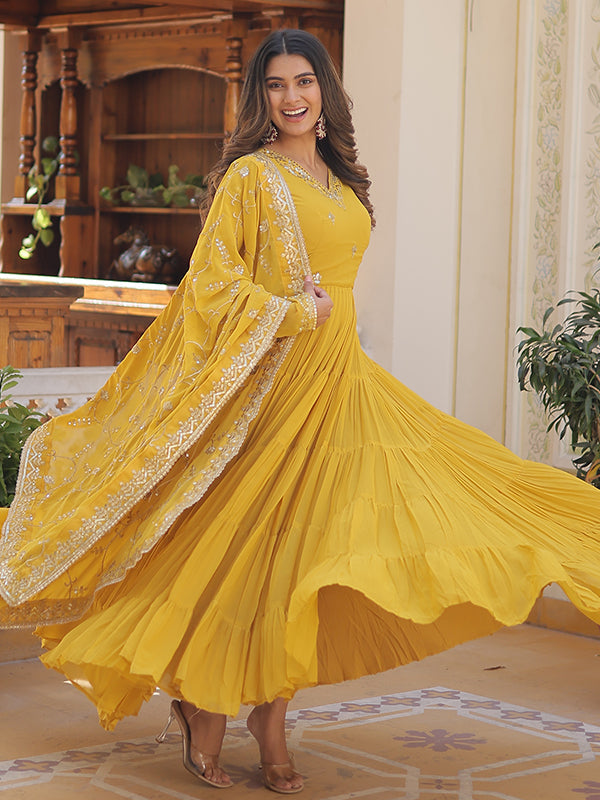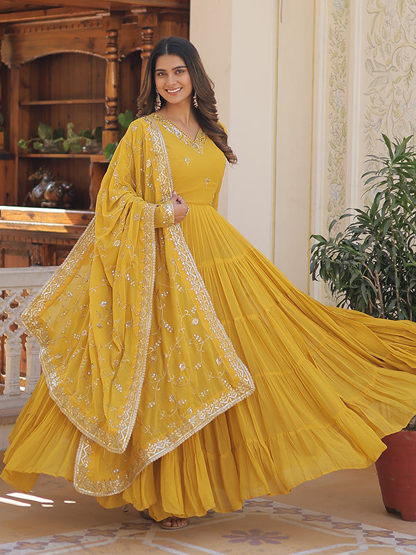 Yellow Faux Georgette with Embroidered Work Gown With Dupatta – Vamikaa
