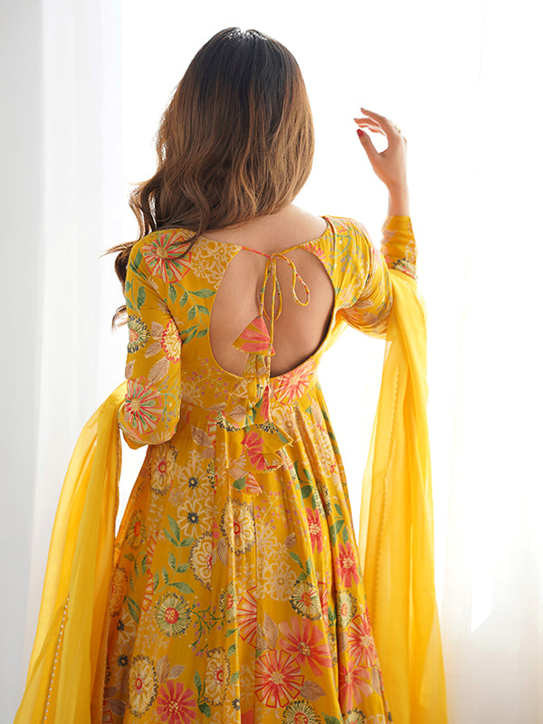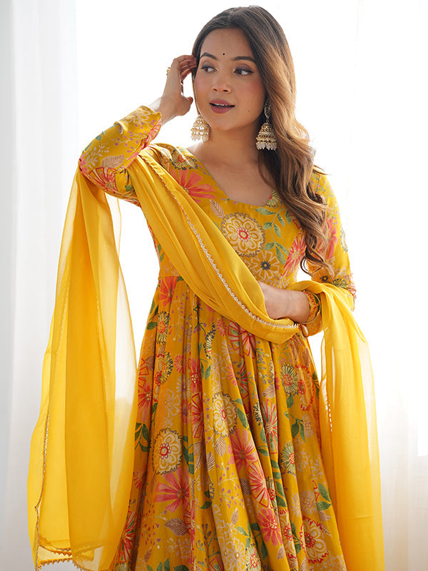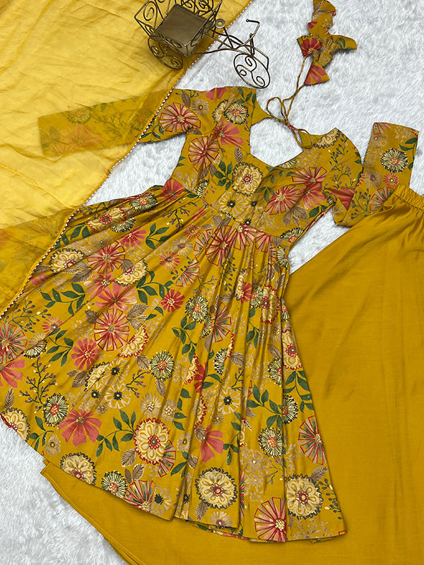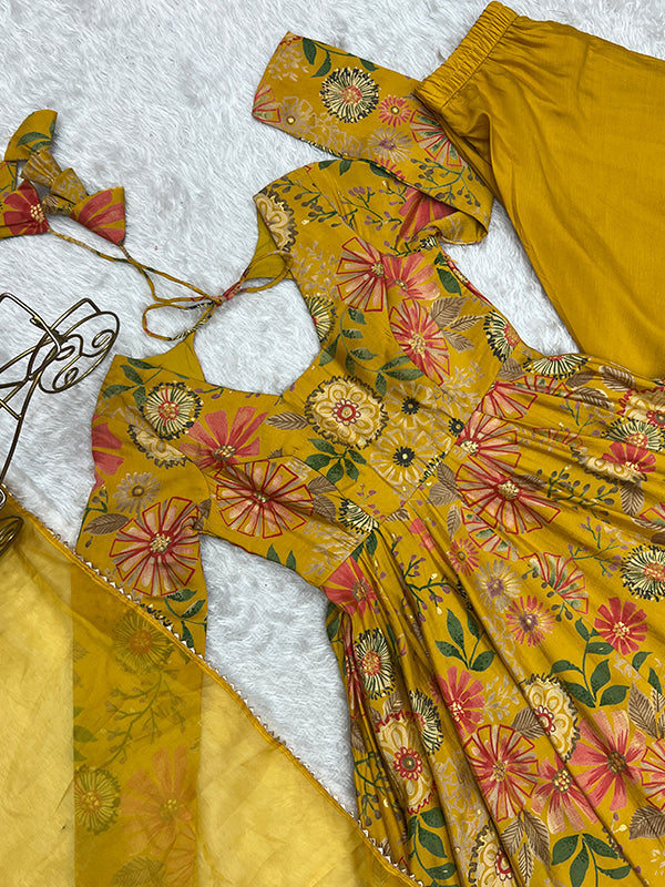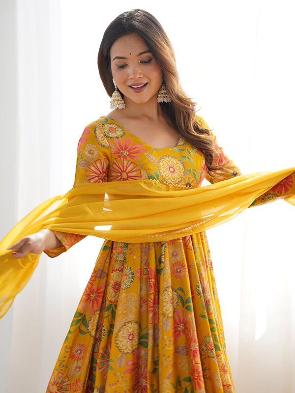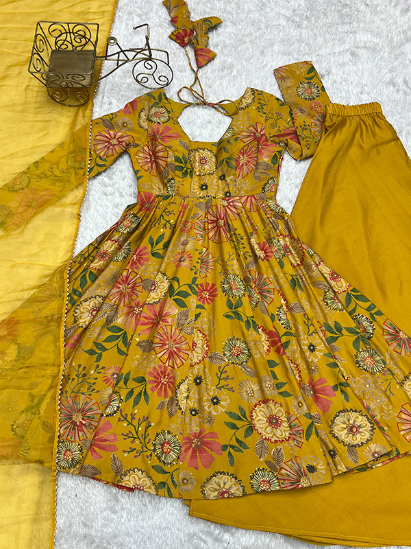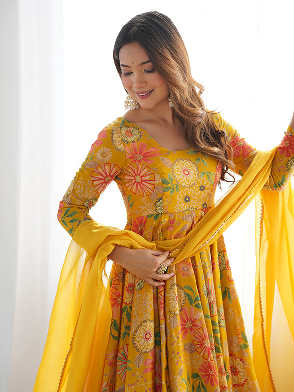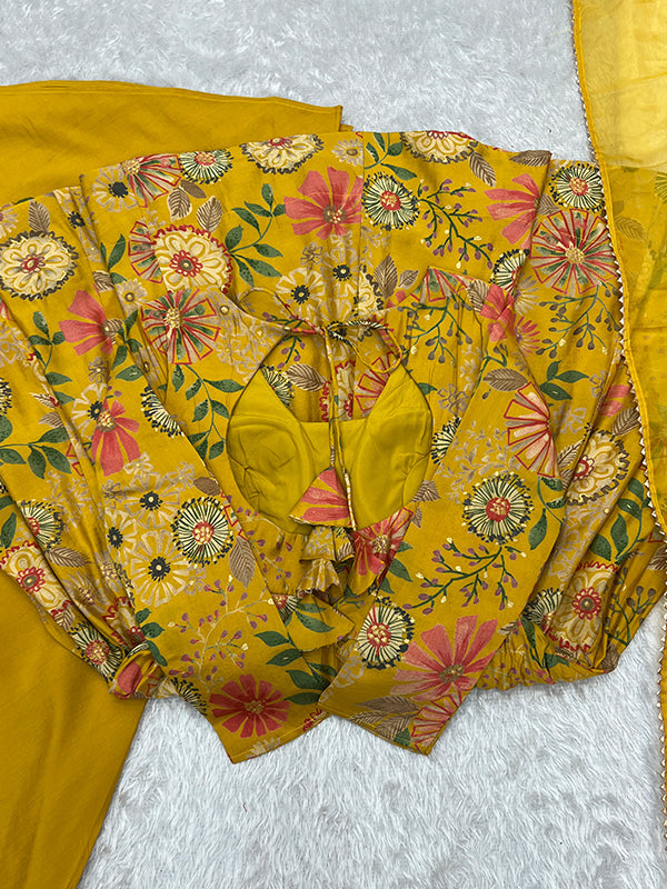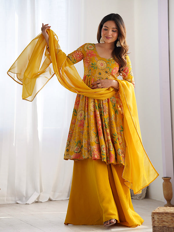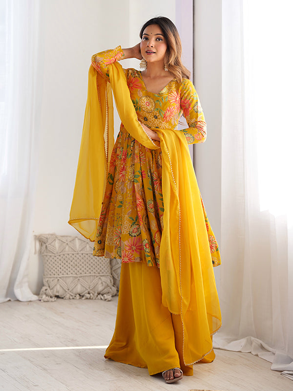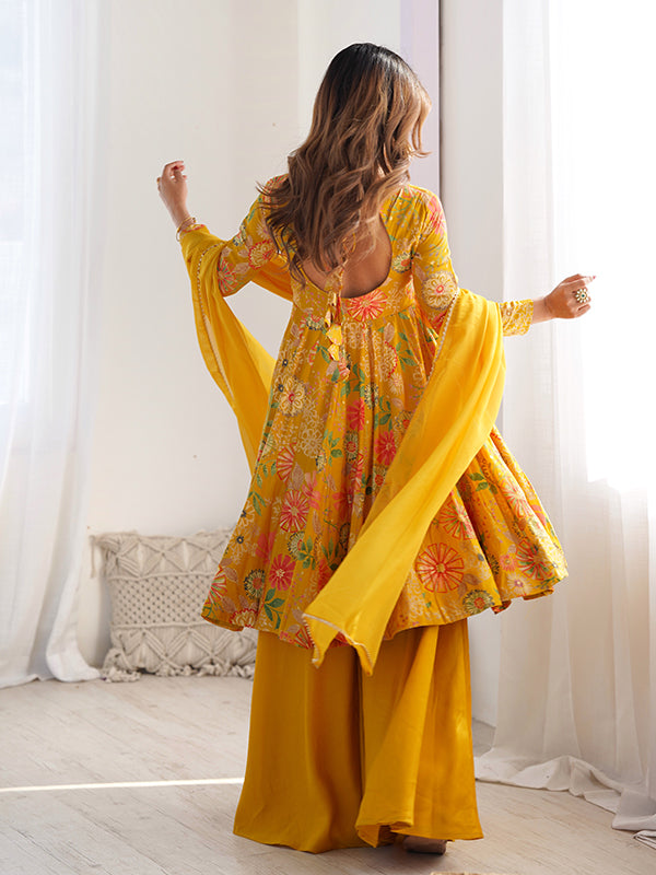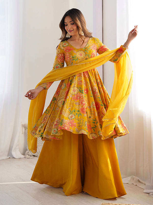 Yellow Roman Silk Printed Kediya Kurta With Flair Palazzo Dupatta Set – Vamikaa